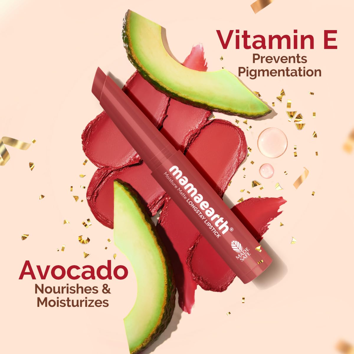 - 8 HOUR MOISTURE LOCK: Infused with Avocado oil and Vitamin E, the Moisture Matte Long Stay Lipstick not only gives rich velvety color but also offers truckloads of moisturization for up to 8 hours.