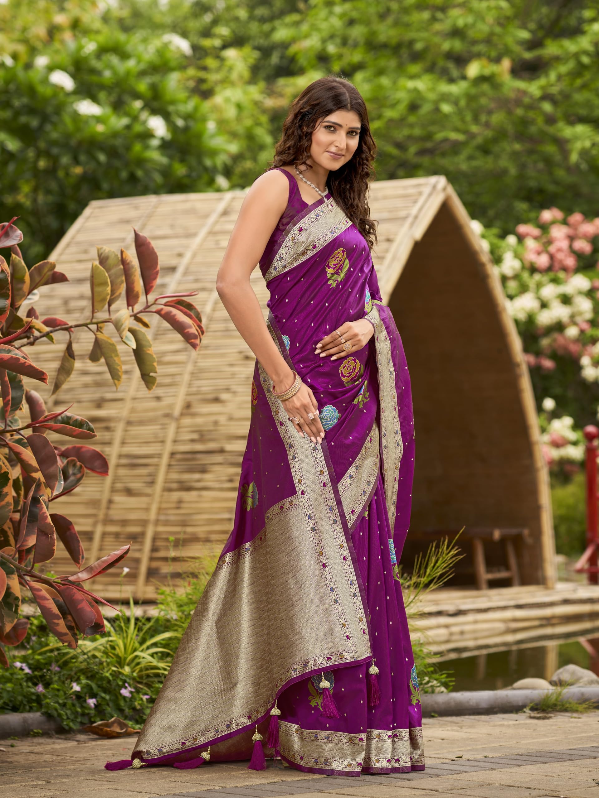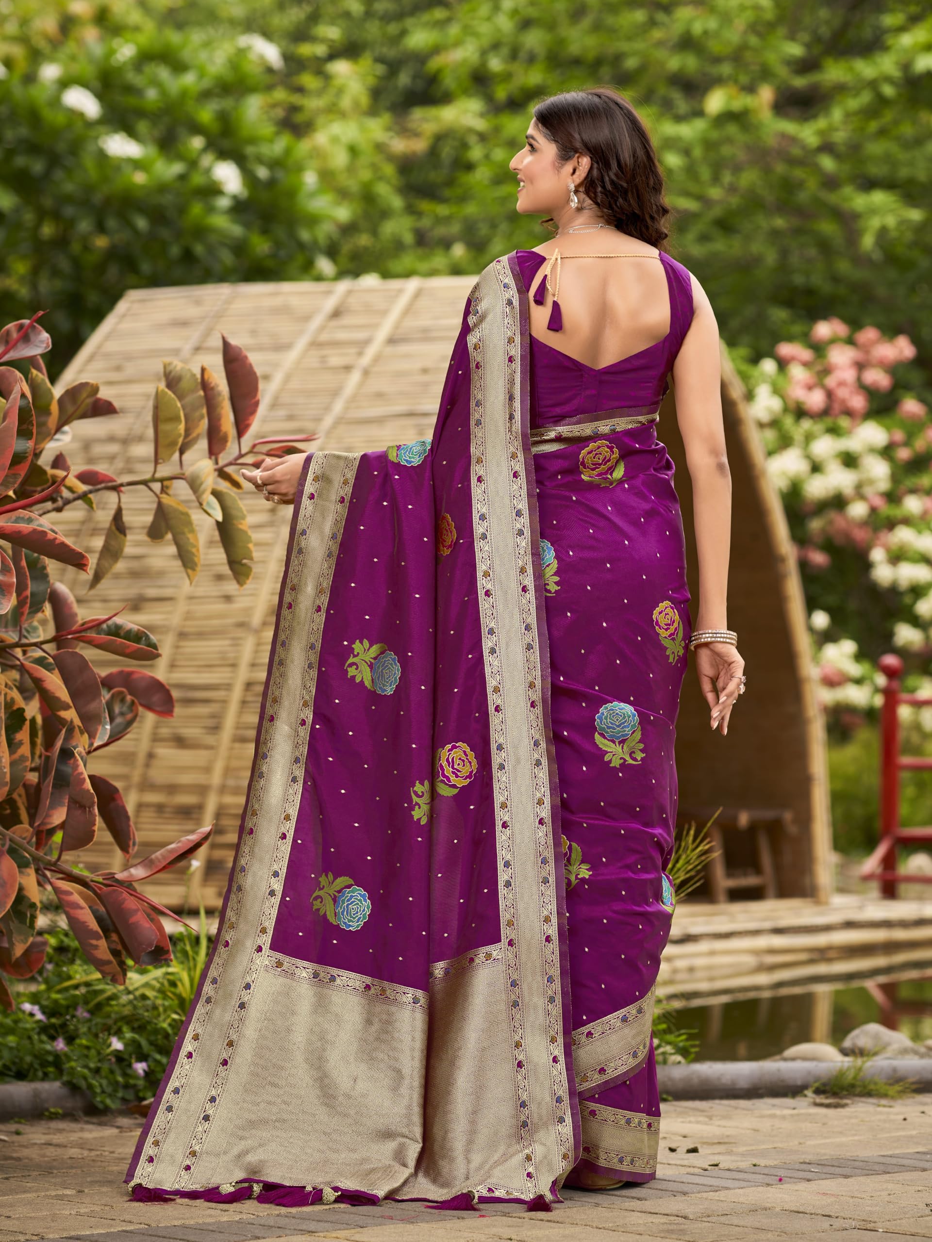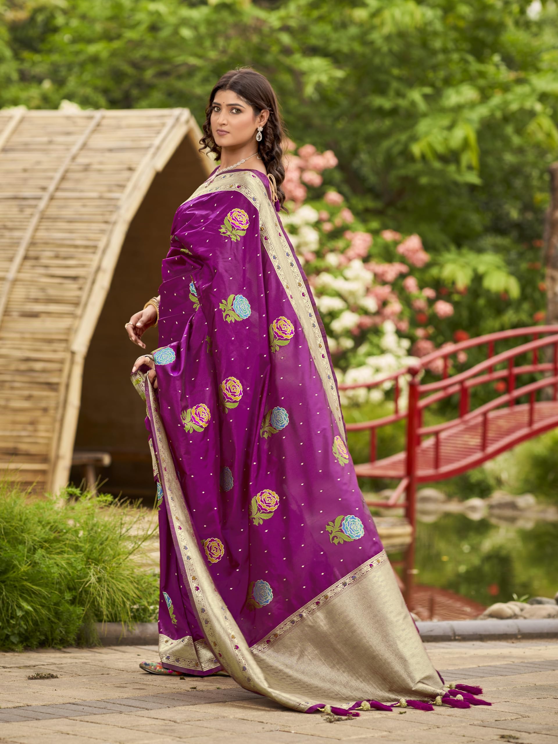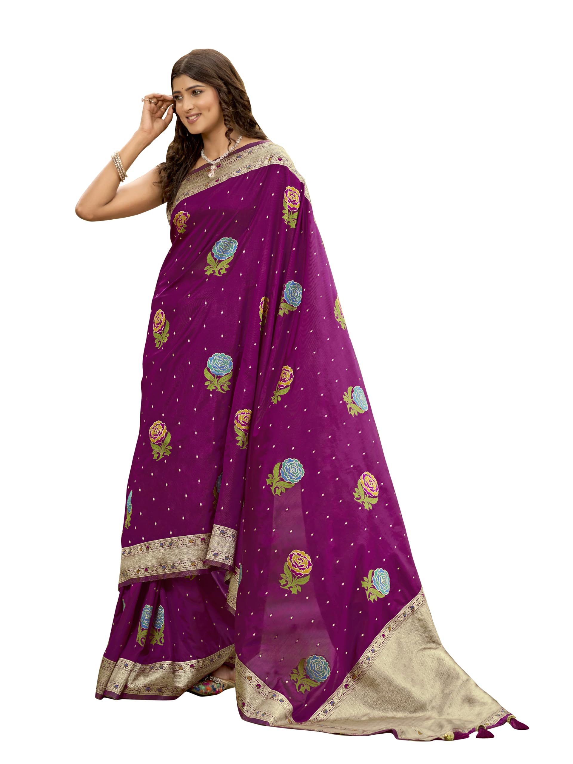 MANOHARI Women's Most Trendy Banarasi Satin Silk Woven Magenta Colorful Flower Pattern Saree With Heavy Jacquard Work Saree With Blouse Piece_MN2035
