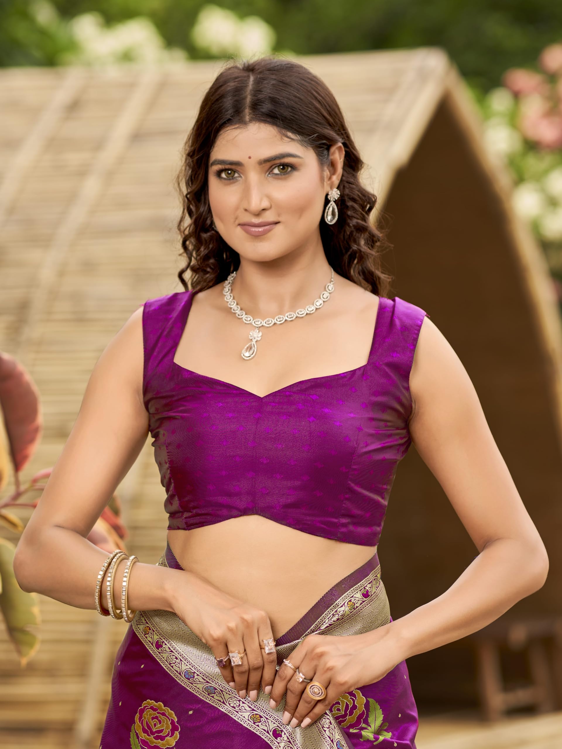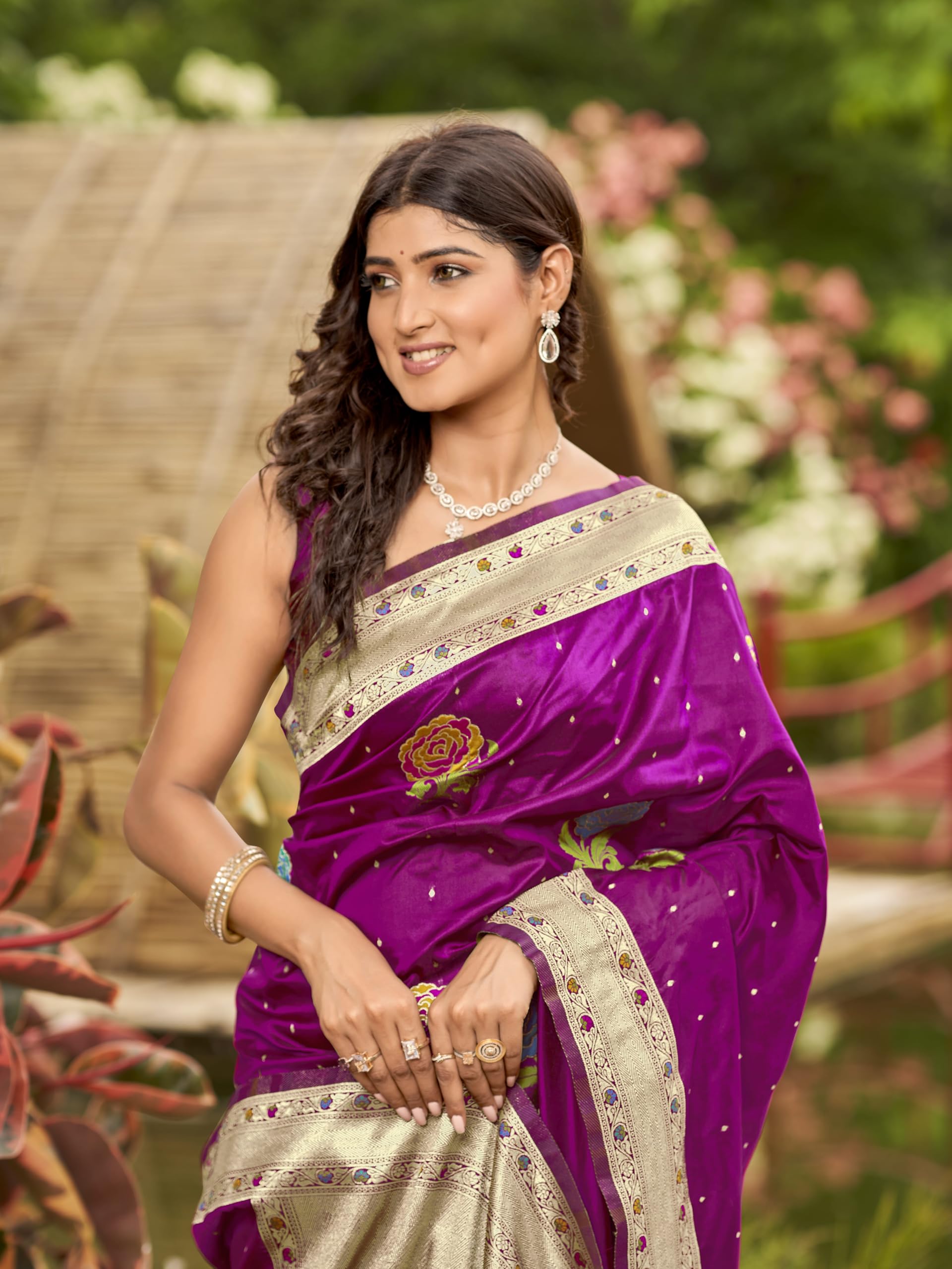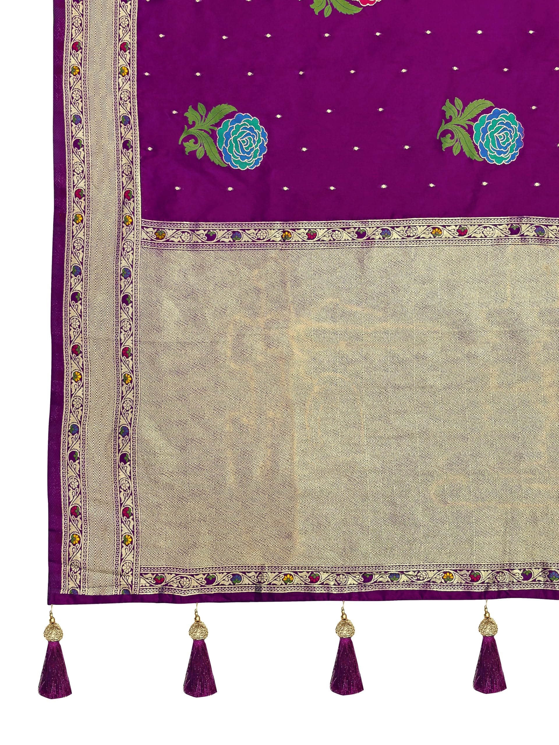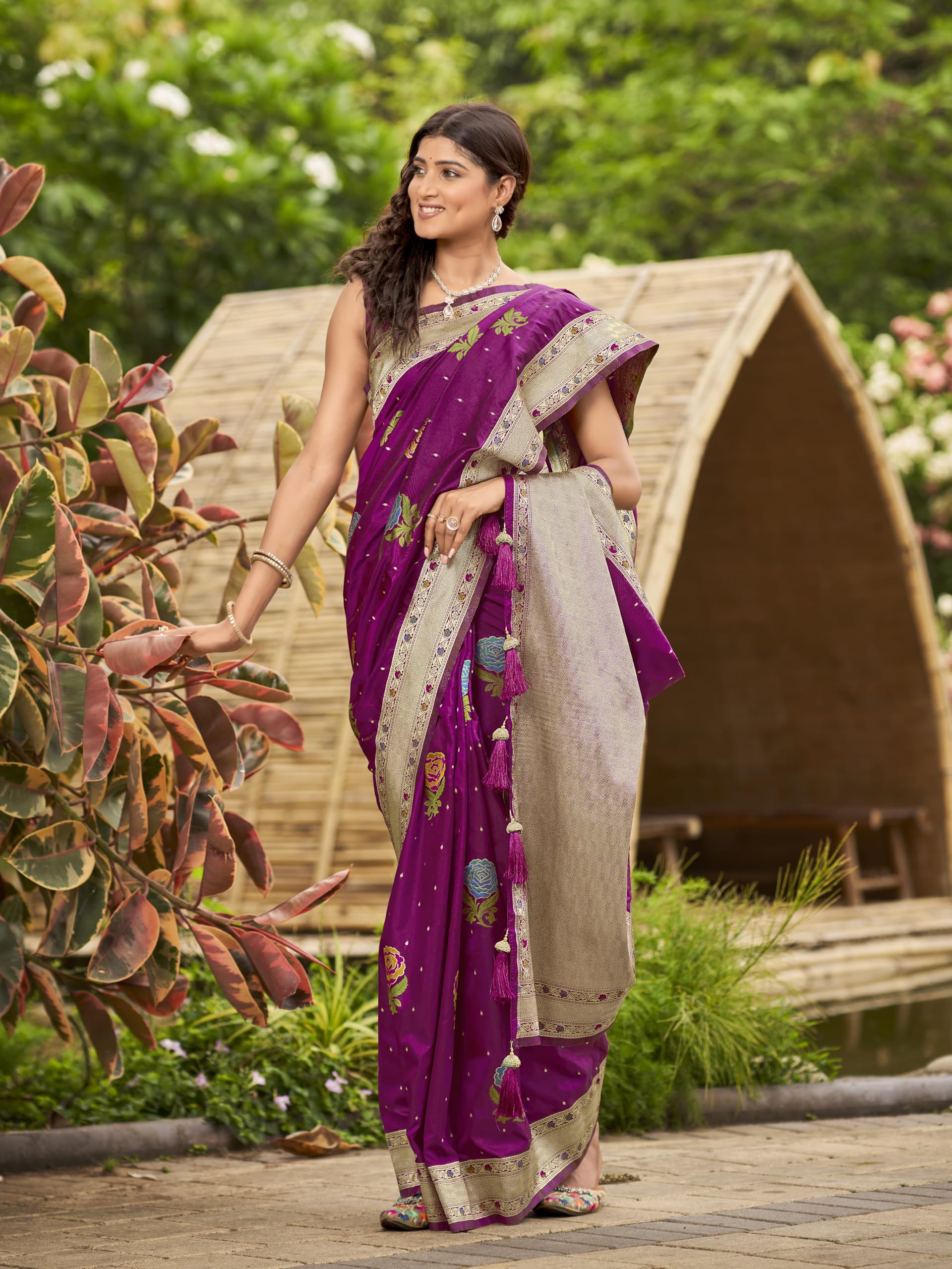 MANOHARI Women's Most Trendy Banarasi Satin Silk Woven Magenta Colorful Flower Pattern Saree With Heavy Jacquard Work Saree With Blouse Piece_MN2035