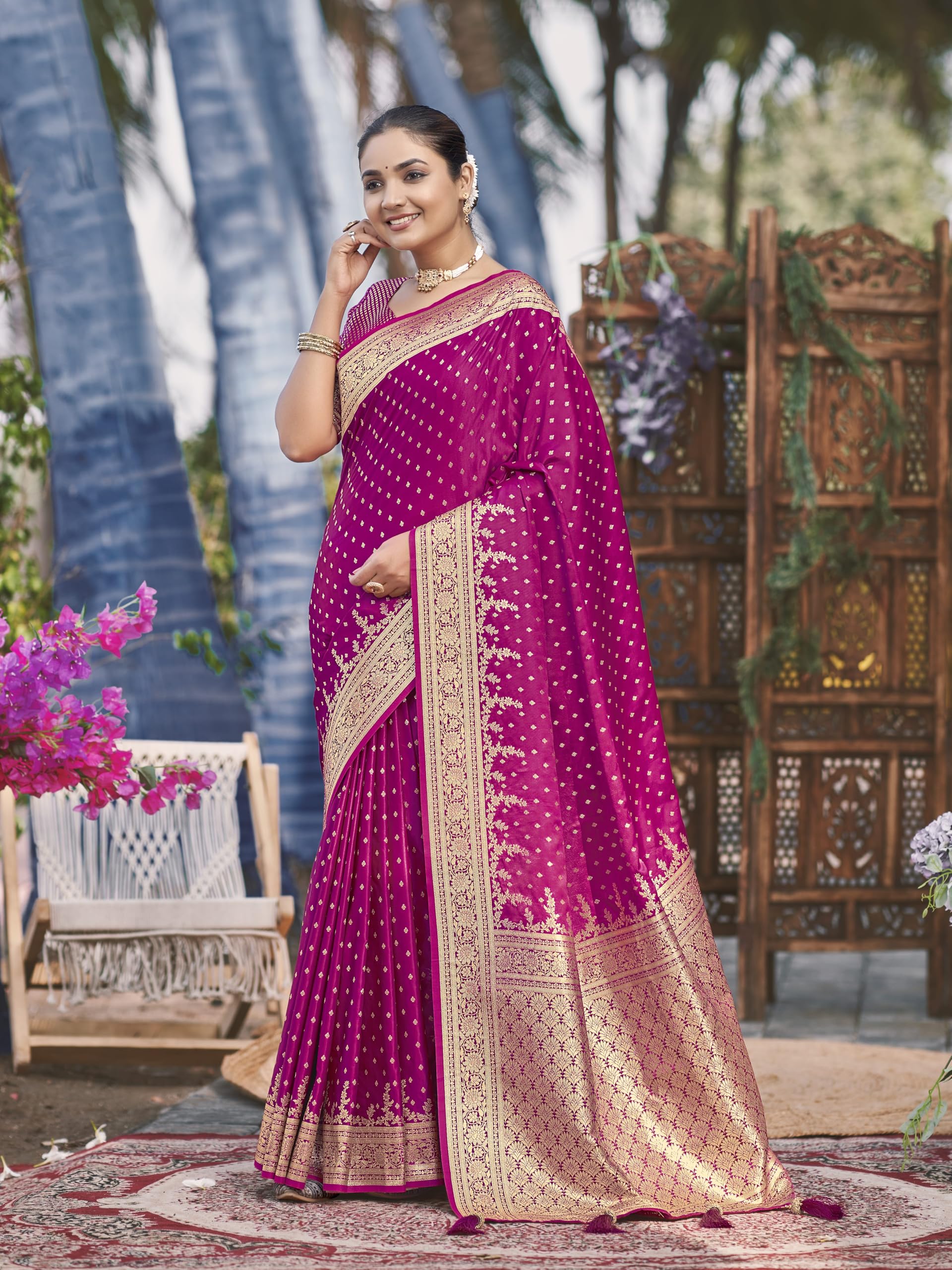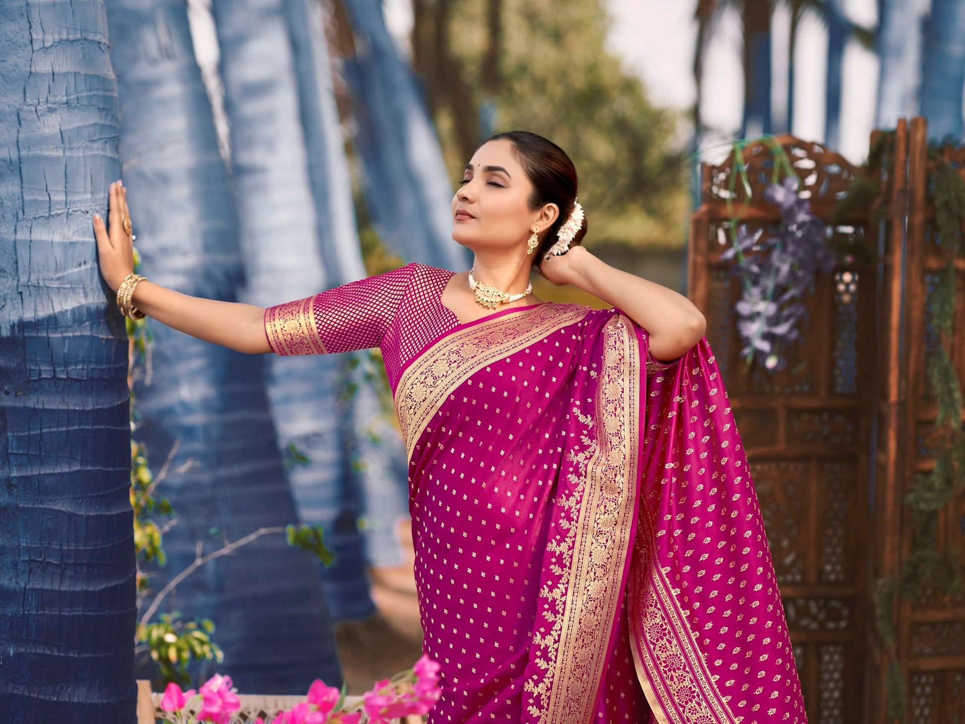 MANOHARI Women's Most Trendy Banarasi Satin Silk Woven Pink Saree With Heavy Jacquard Work Saree With Blouse Piece_MN1994