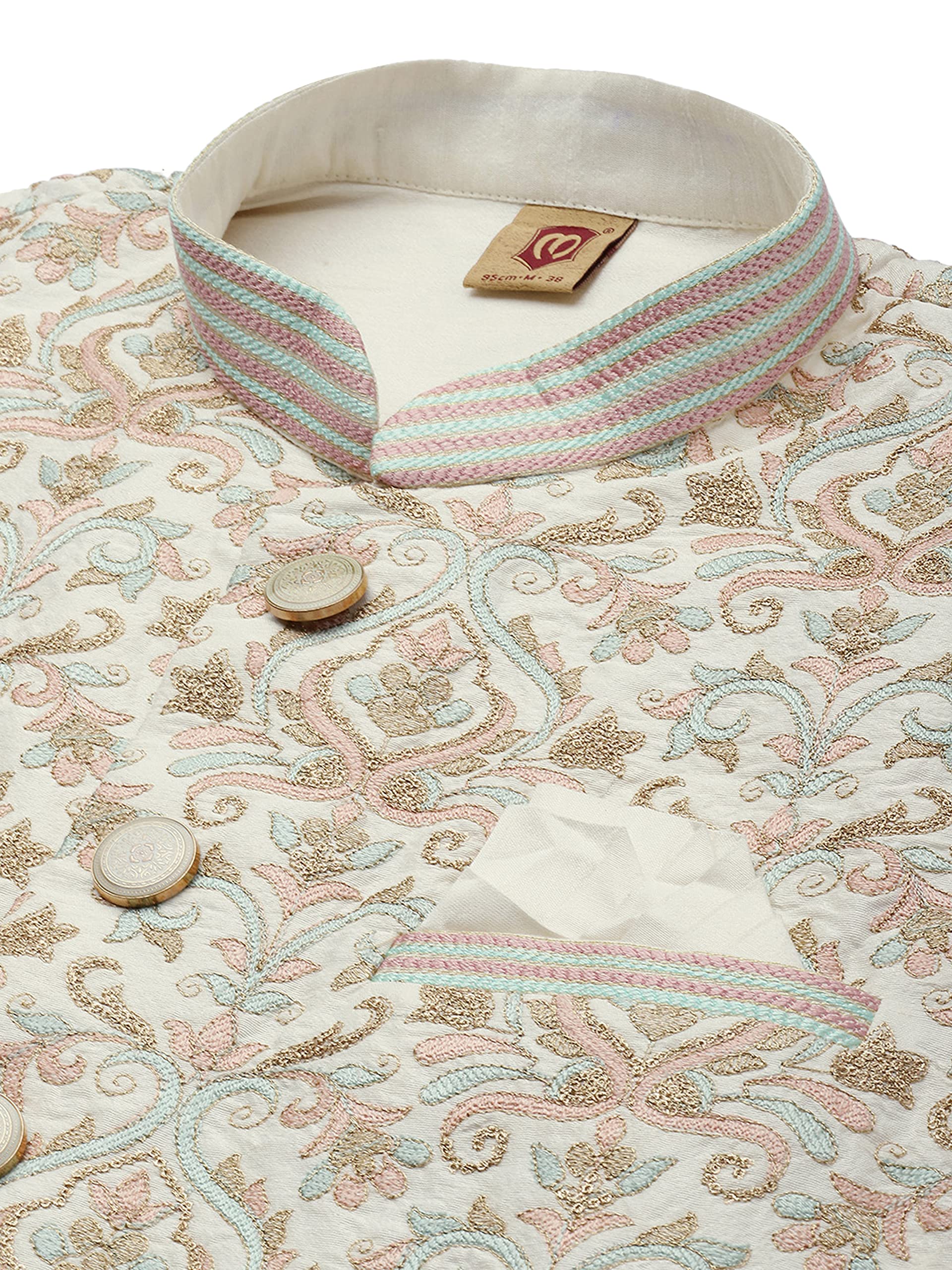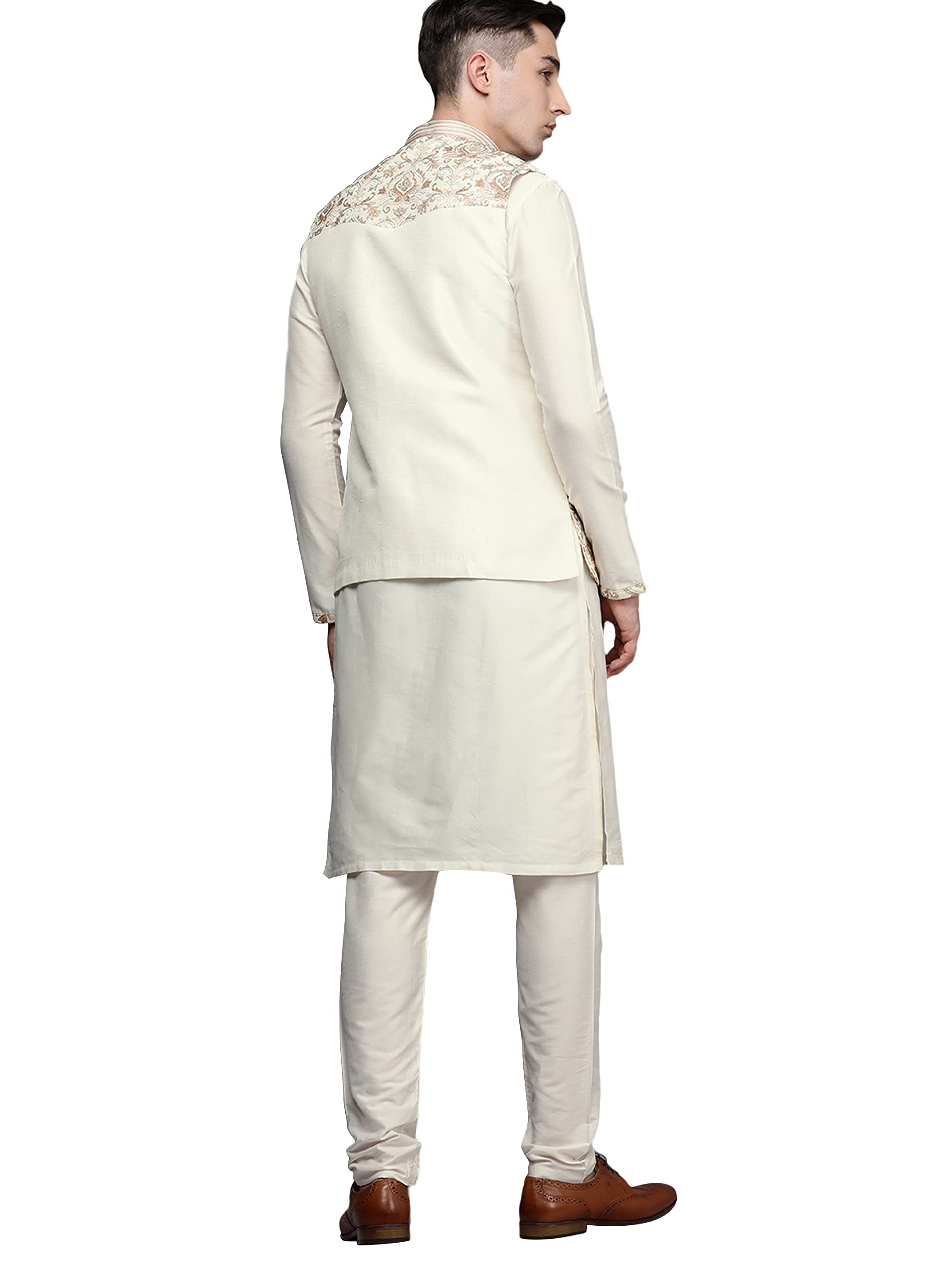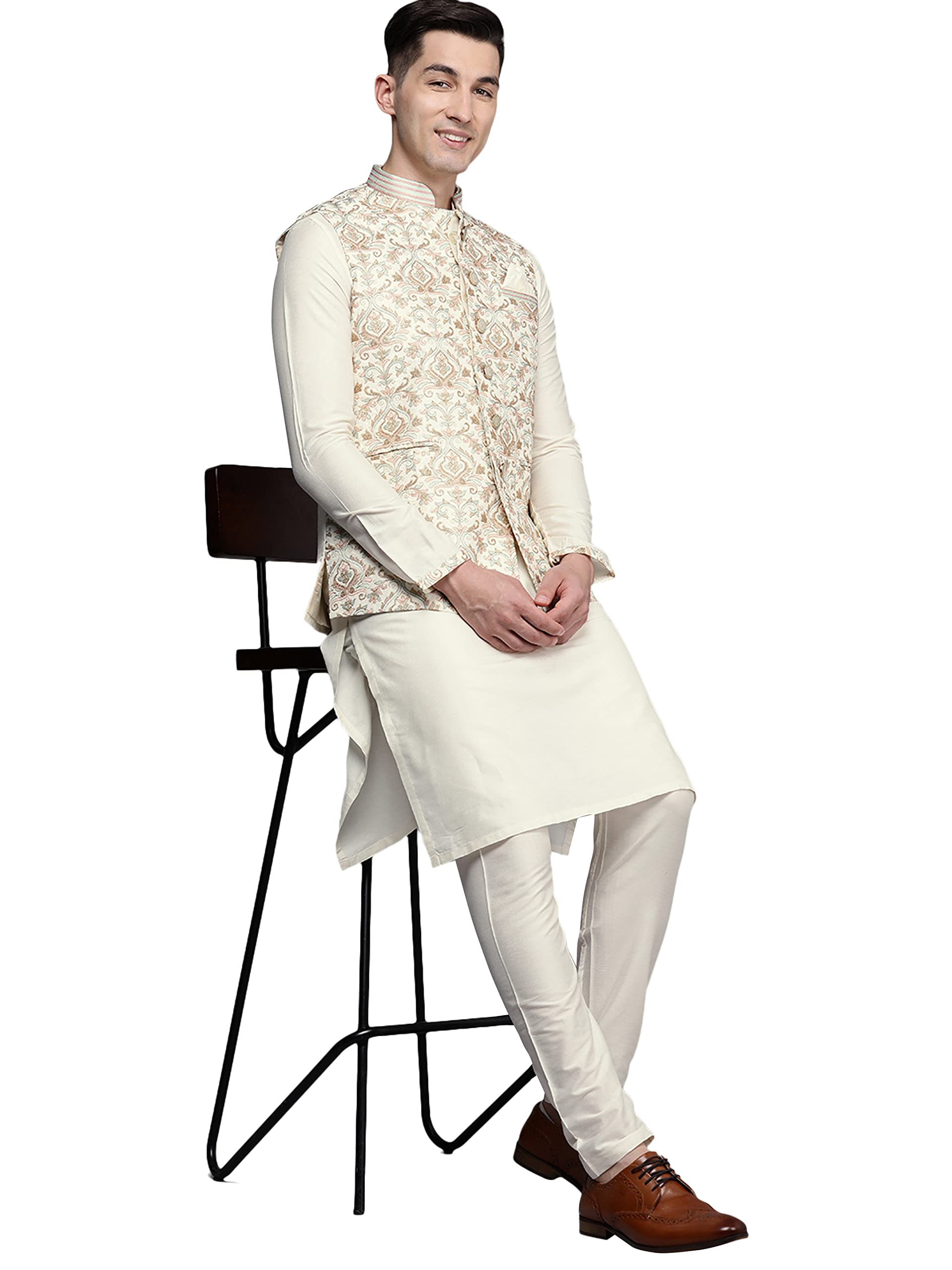 Manyavar Kurta Jacket Set for Men, Full Sleeves Mandarin Collar Ethnic Kurta Jacket Set for Festival, Wedding, Party Blended Viscous (Off White) (M)