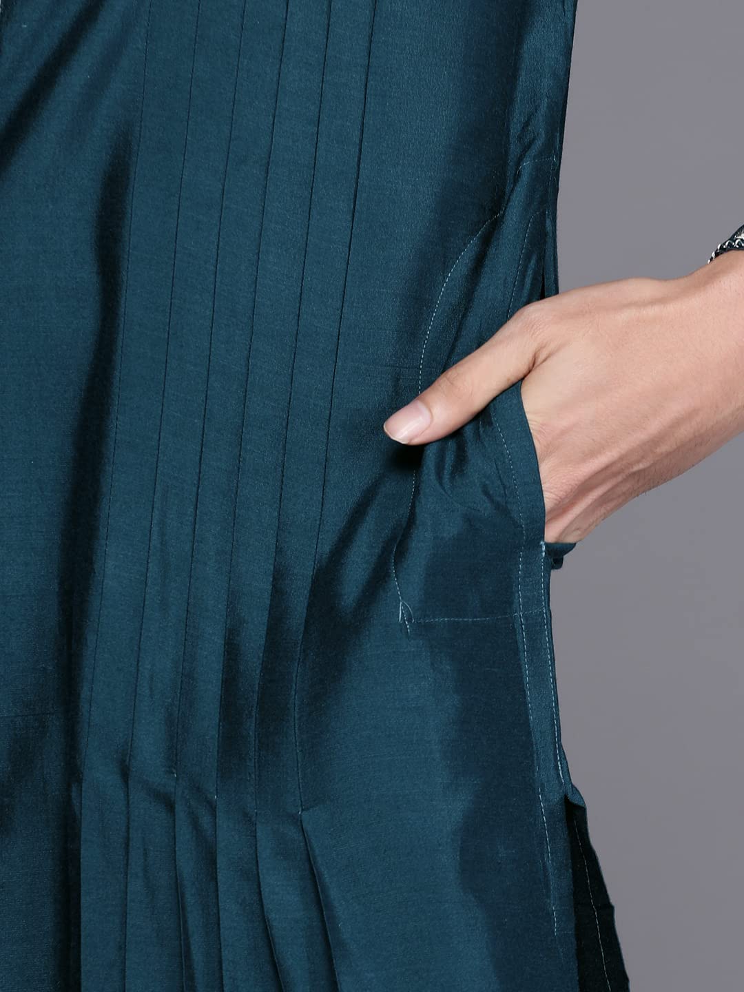 Manyavar Kurta Jacket Set for Men, Full Sleeves Mandarin Collar Ethnic Wear Jacket Set for Festival, Wedding, Party Blended Viscose (Blue, XL)