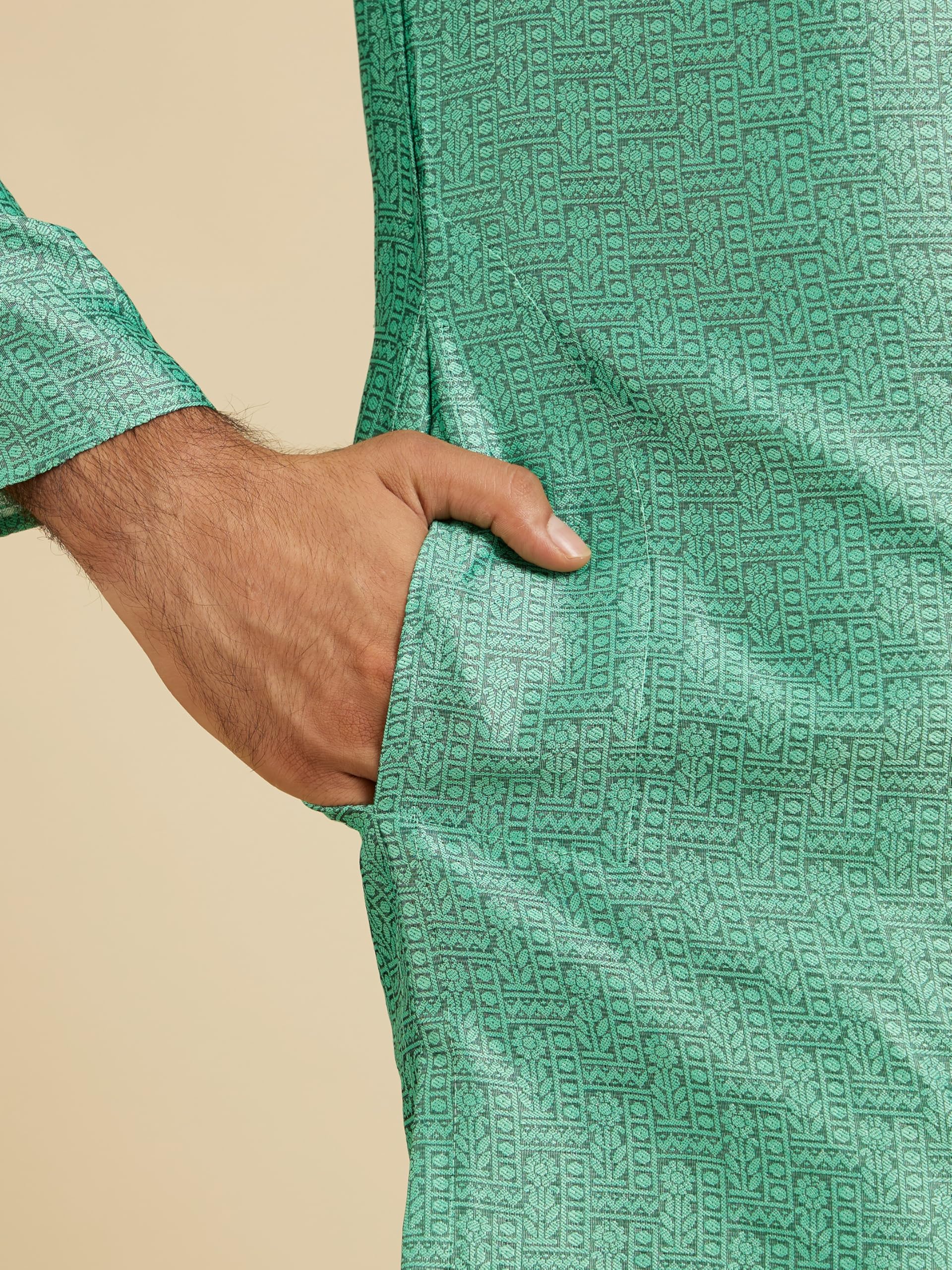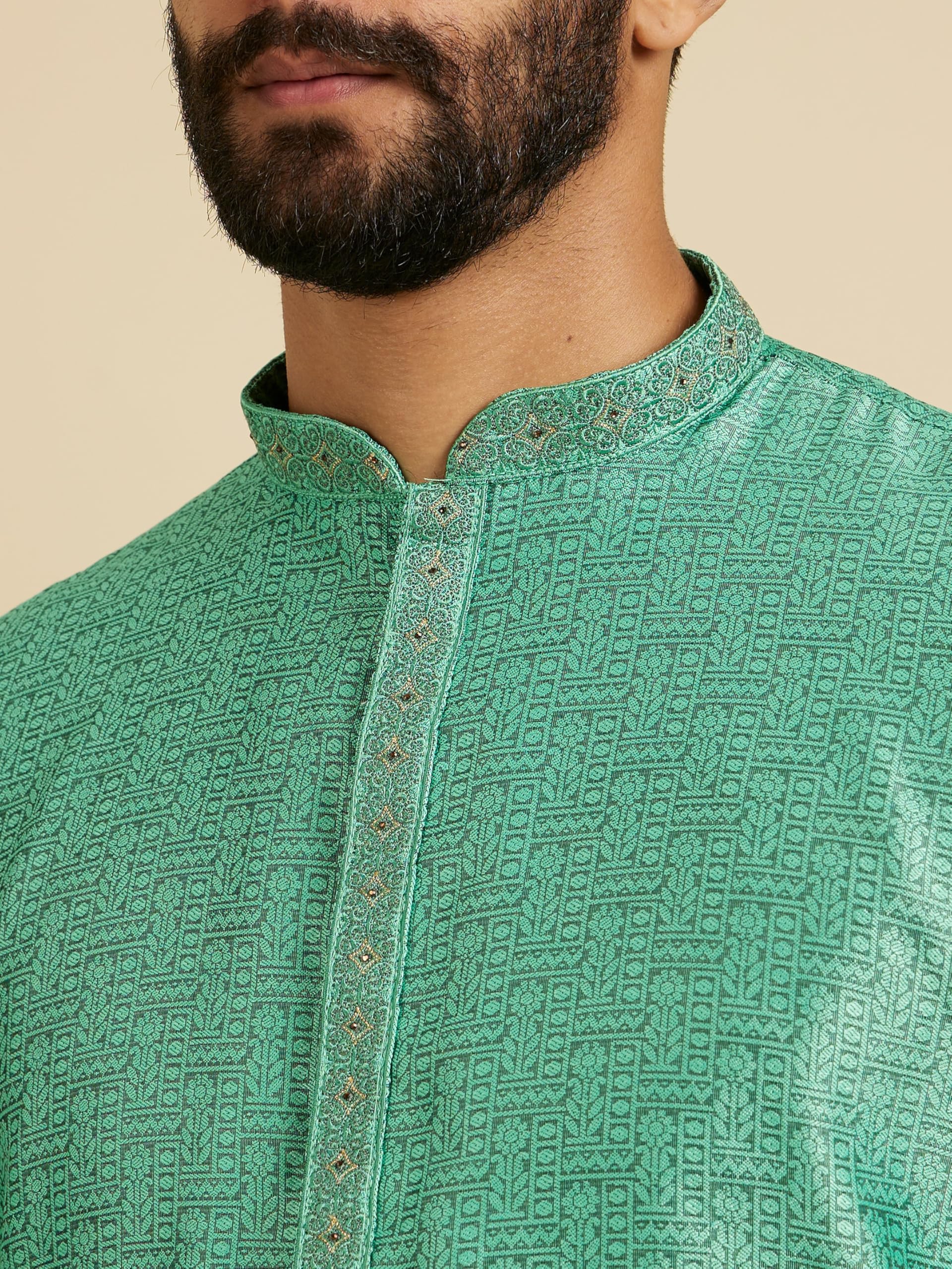 Manyavar Men's Art Silk Intricate Prints & Neck Detailing Kurta Pyjama Set (Green,L)