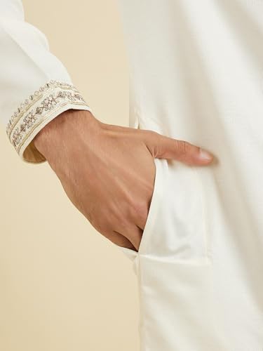 Manyavar Men's Art Silk Neckline Embroidered Kurta Churidar Set(Cream,XXXL)