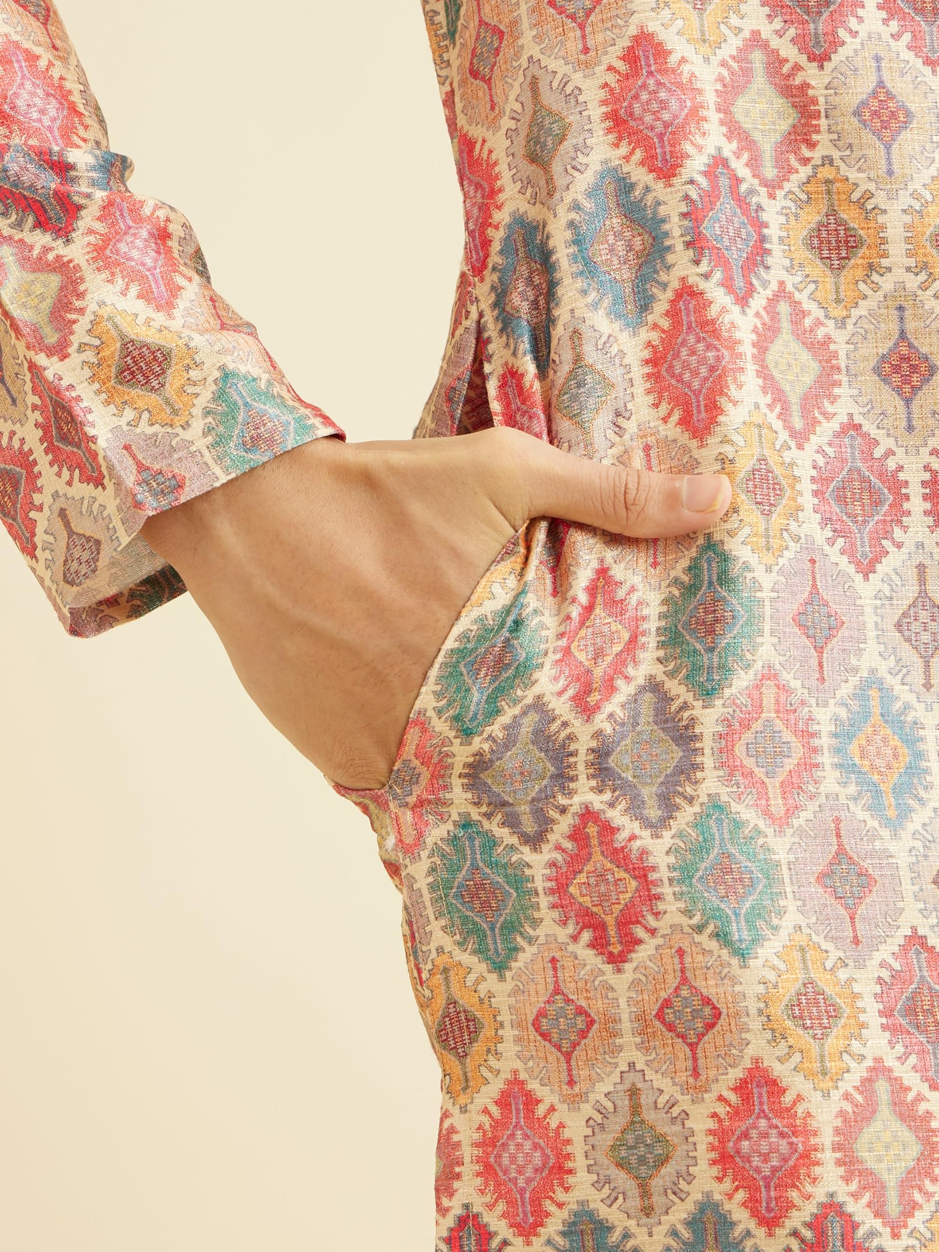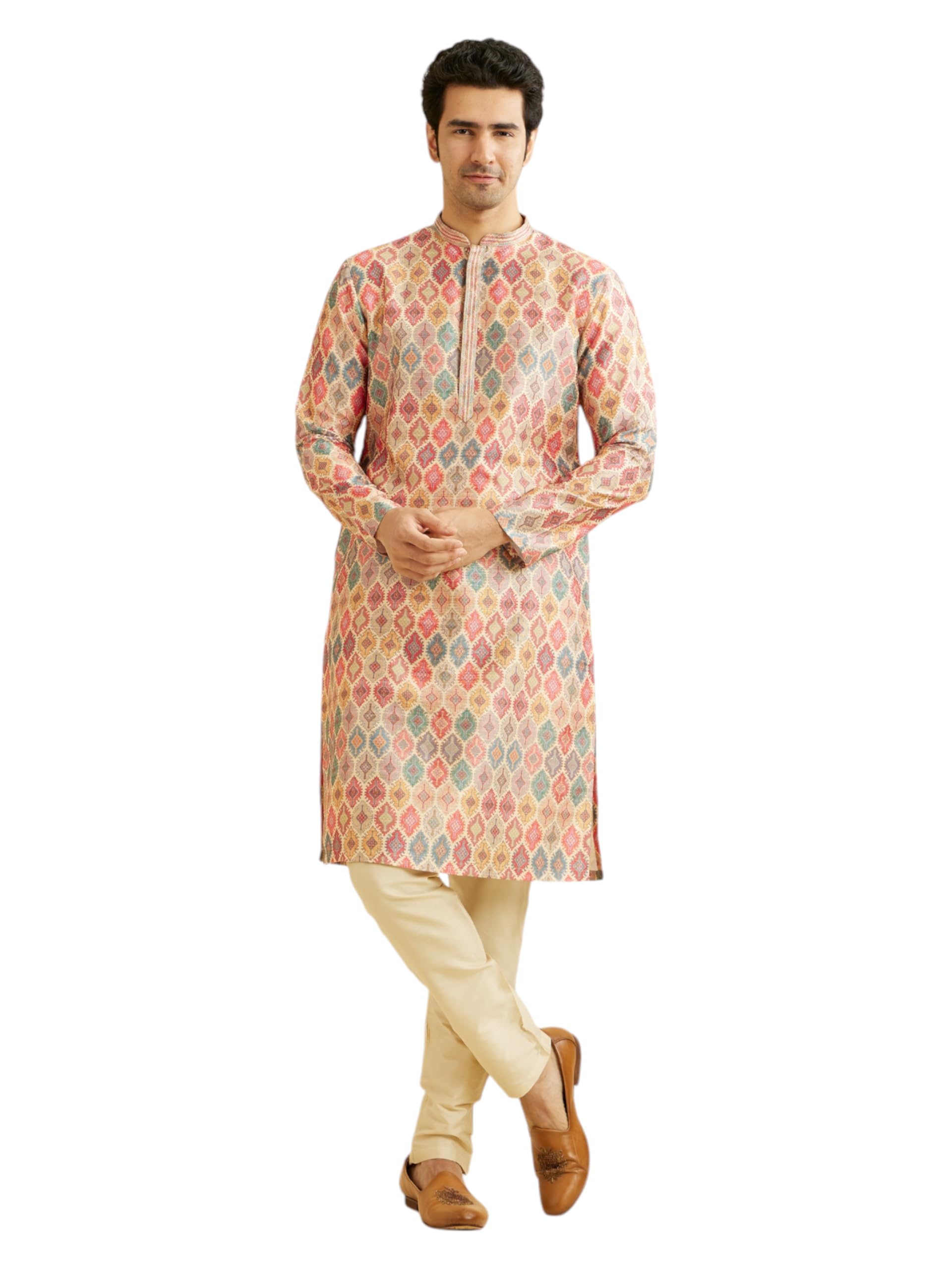 - Design:-Step into elegance with our soft beige ikat inspired ogee print kurta set. This kurta set features a delicate ogee pattern, inspired by traditional Ikat weaving, offering a sophisticated yet understated look. Ideal for festive occasions and cultural events, this kurta set combines classic charm with contemporary style, ensuring you stand out effortlessly. Pair it with white churidar and tan leather sandals for a refined and stylish ensemble