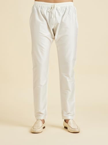 - Design: Experience the epitome of comfort and style with this warm white Manyavar kurta pajama. Its elegance is lent by the high-quality silk fabric used, transforming your appearance for any festive or wedding occasion. Exemplifying sophistication, the ensemble includes both kurta and pyjama for an exceptional traditional look.