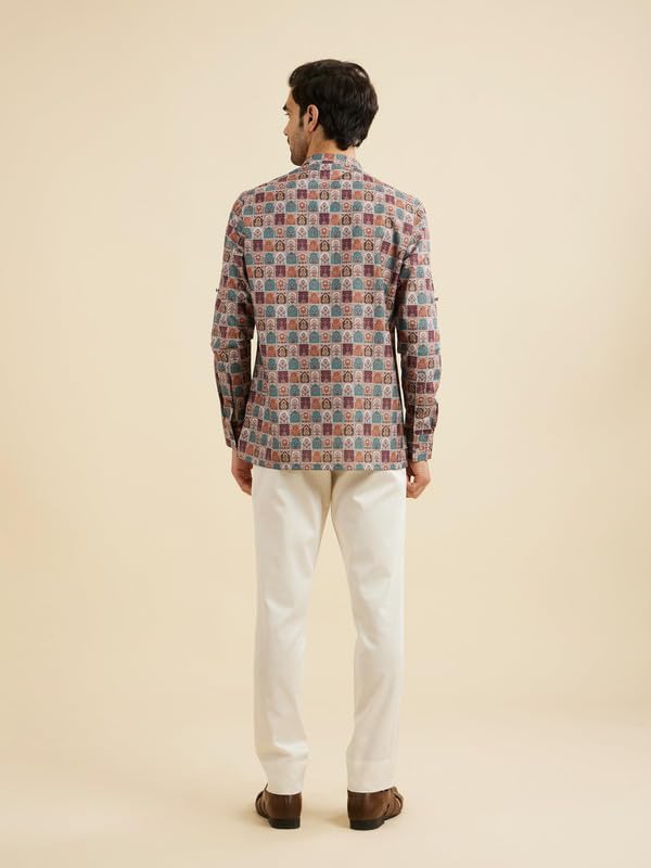 - Design: Exude regal charm with our soft beige imperial darbar printed short kurta for men. Featuring an elegant darbar-inspired print, this kurta blends royal motifs with contemporary design, creating a timeless appeal. Pair it with white churidar and brown leather sandals for a refined look that celebrates heritage while embracing modern style.