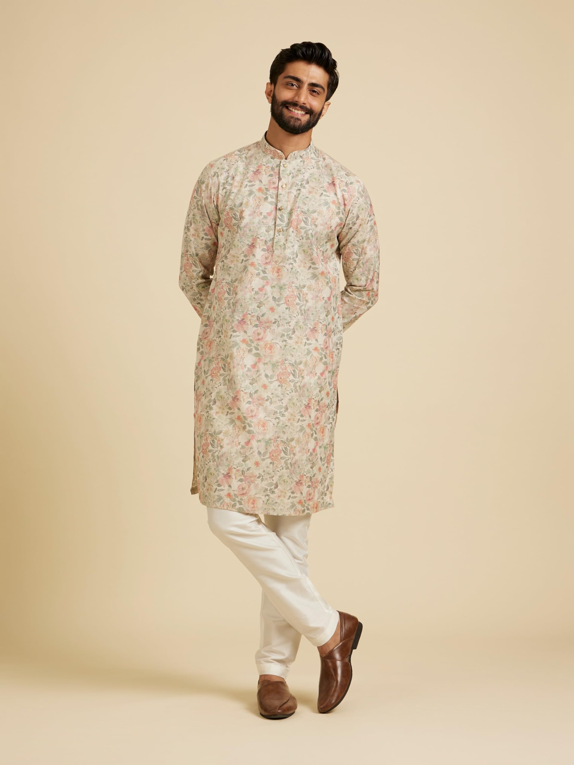 Manyavar Men's Cotton Blend Floral Print Kurta (Beige,XL)