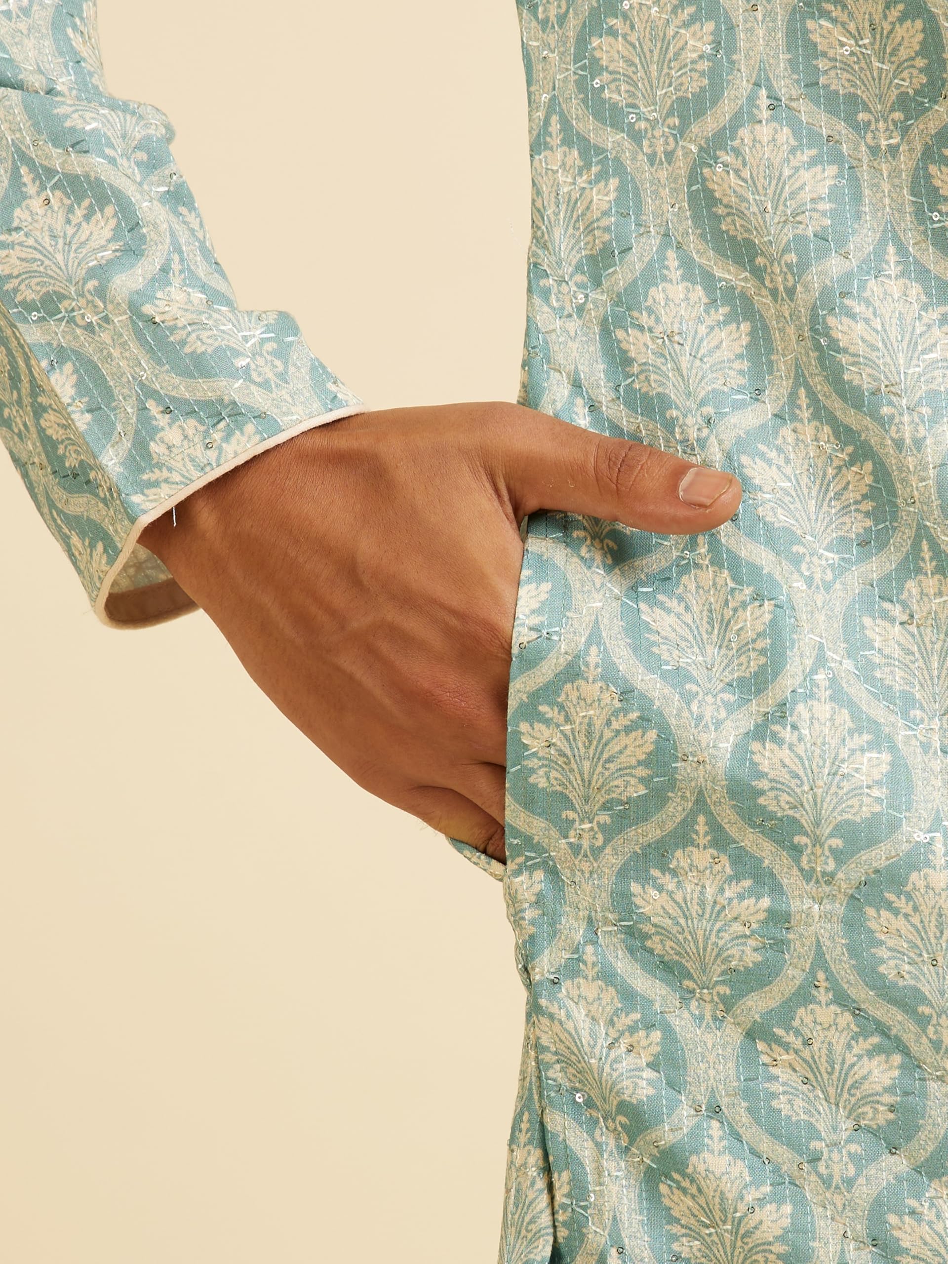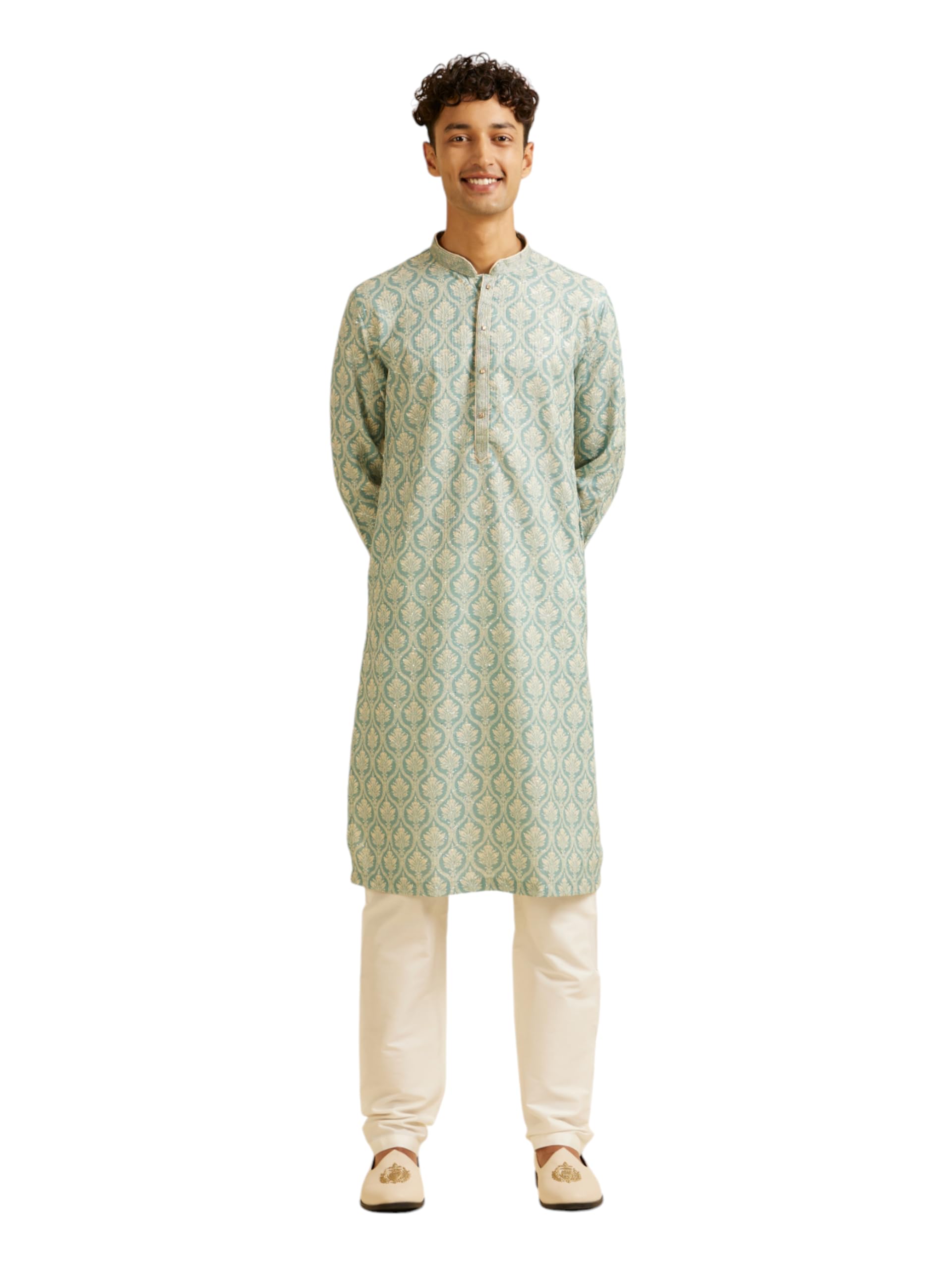 - Design:- Step into elegance with our Light Mid Green Medallion Patterned Kurta Set. This refined ensemble features intricate medallion motifs, offering a perfect blend of tradition and modernity. The soothing green hue adds a touch of freshness, making it ideal for festive occasions and celebrations. Pair it with tan sandals and a matching pyjama for a coordinated look. Add a classic watch and a sleek hairstyle to enhance its sophisticated appeal.