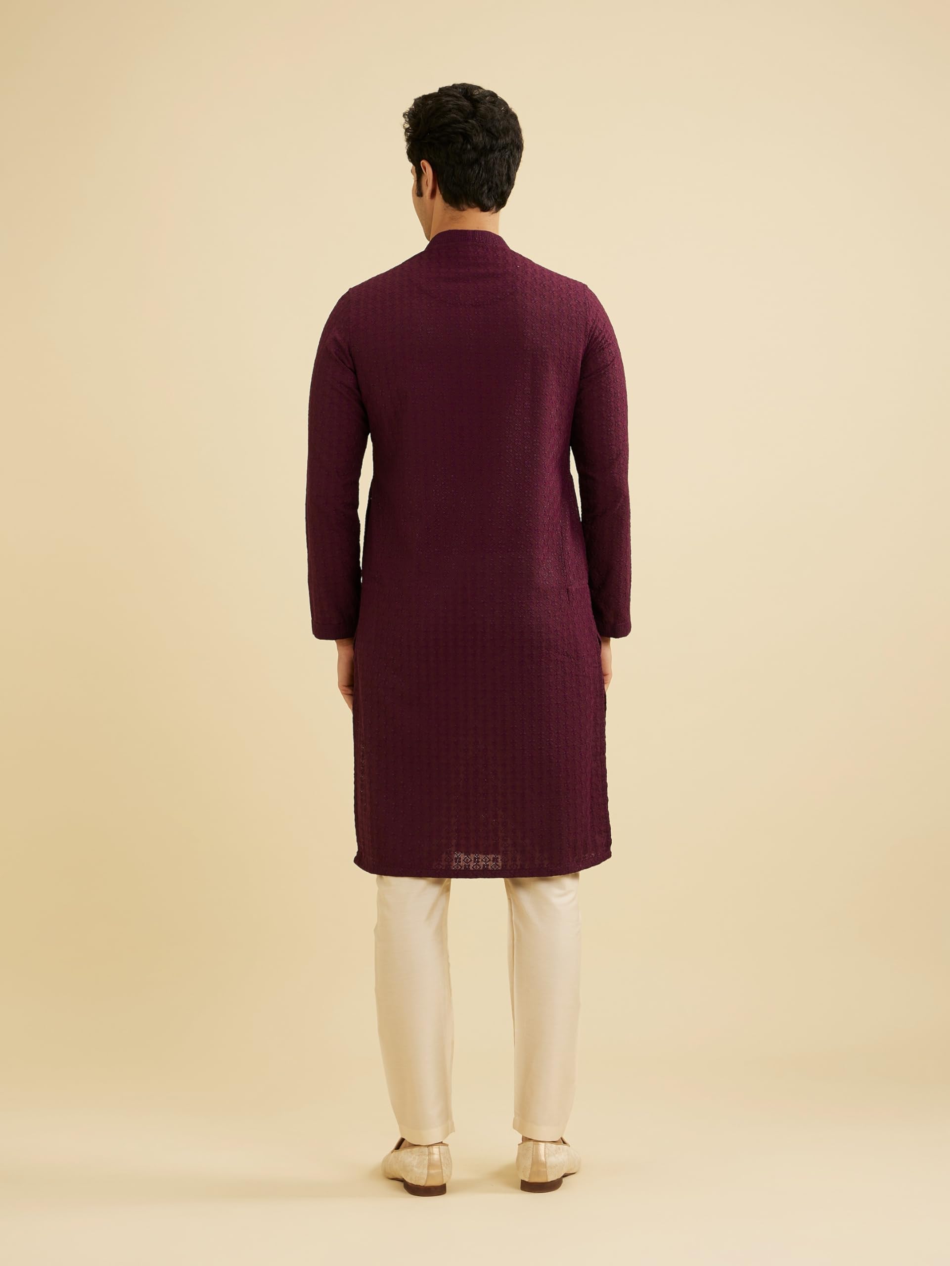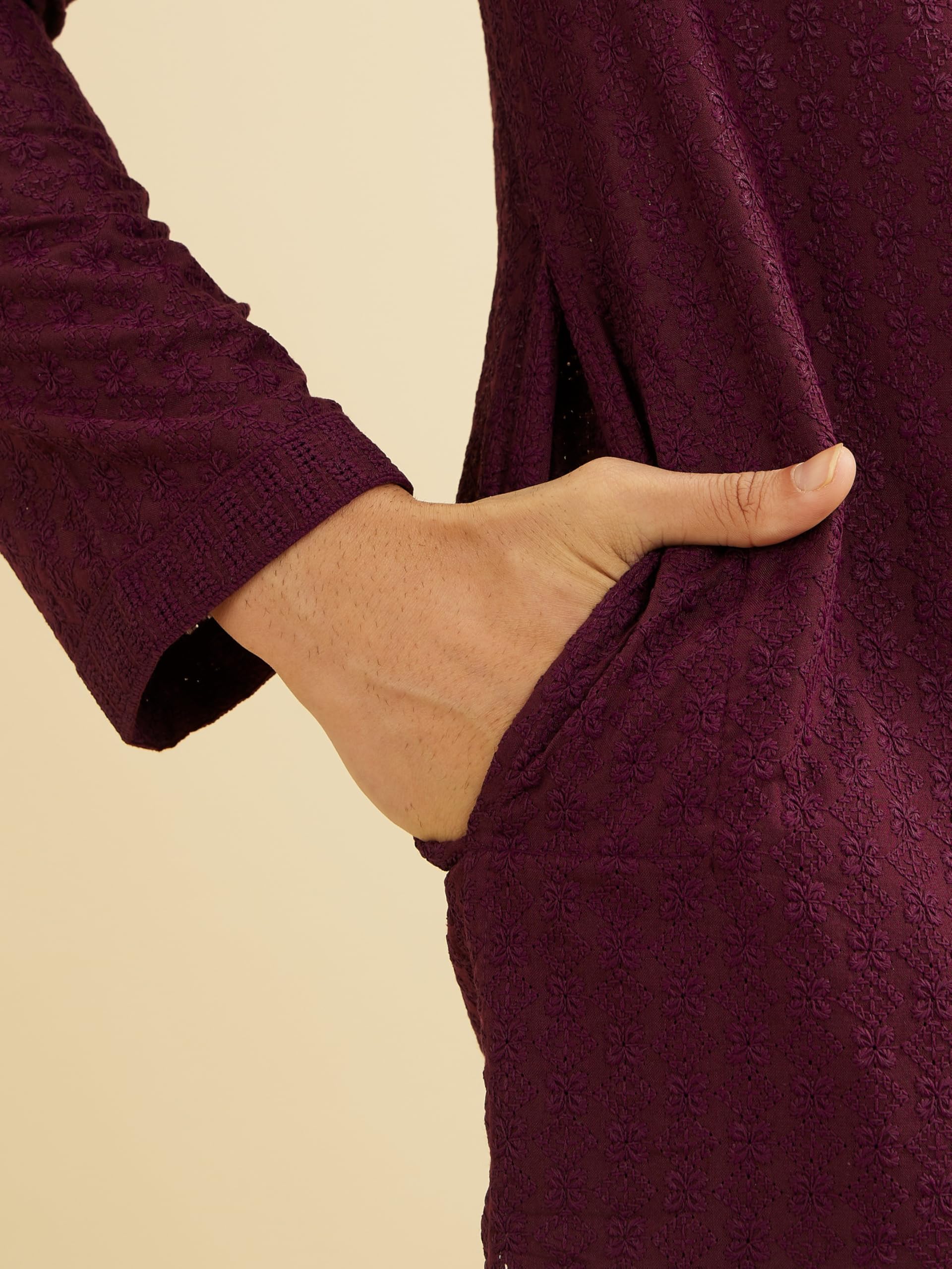 Manyavar Men's Cotton Blend Traditional Chikankari Kurta Pyjama Set (Wine,L)
