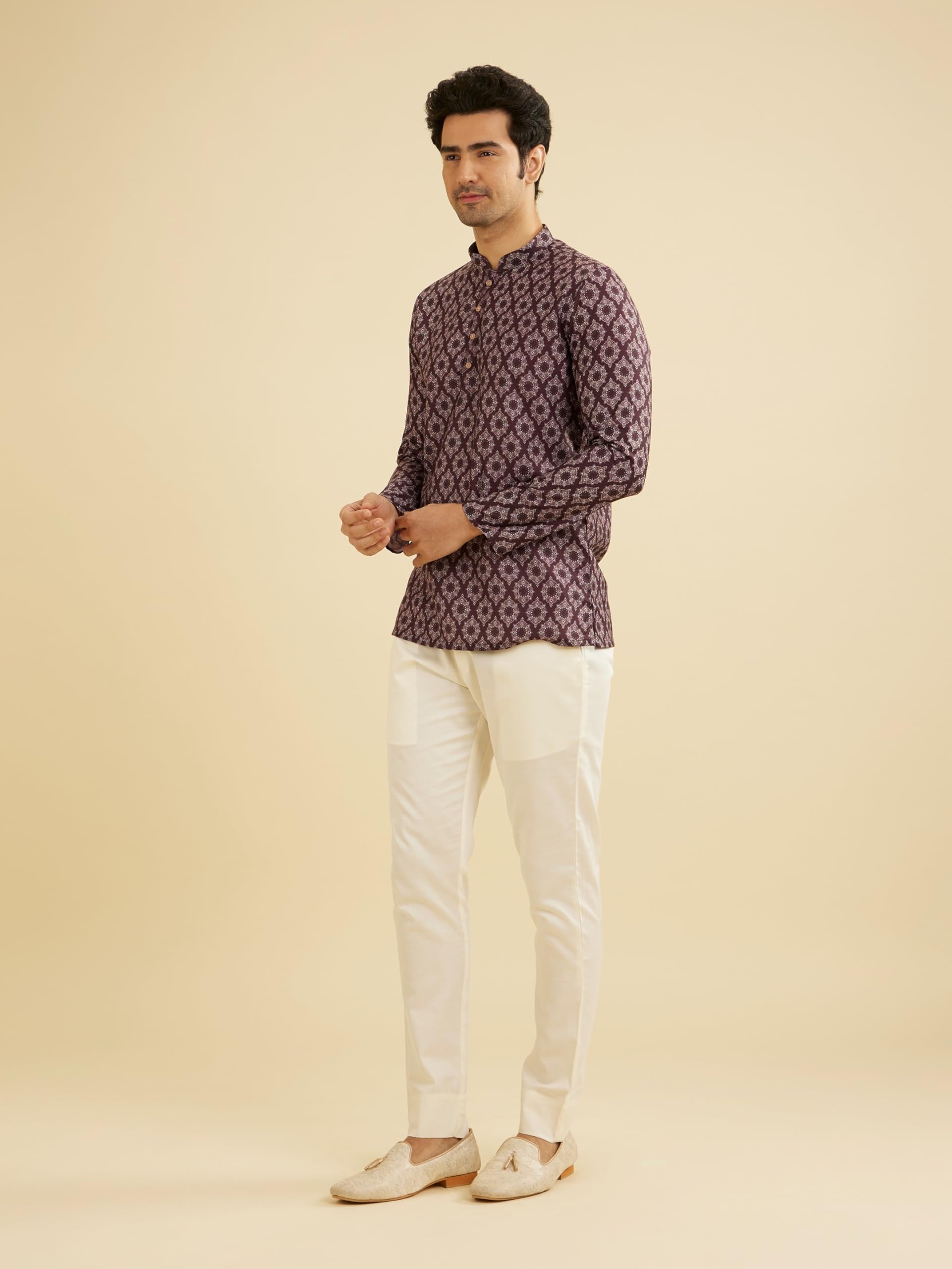 - Design:-This wine red short kurta exudes elegance with its intricate jaal and medallion patterns. The rich color combined with the fine detailing adds a regal touch, perfect for any traditional event or casual gathering. Pair this kurta with off-white or beige churidar pants and leather loafers for a sharp, sophisticated look.