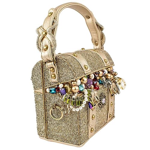 - Make a stunning fashion statement with the Mary Frances Secret Treasure Top Handle Treasure Chest Handbag, Gold. Handcrafted to perfection, this unique handbag is adorned with an exquisite array of sparkling gems, beads, and baubles, creating a captivating and unforgettable design that is sure to turn heads at any occasion.