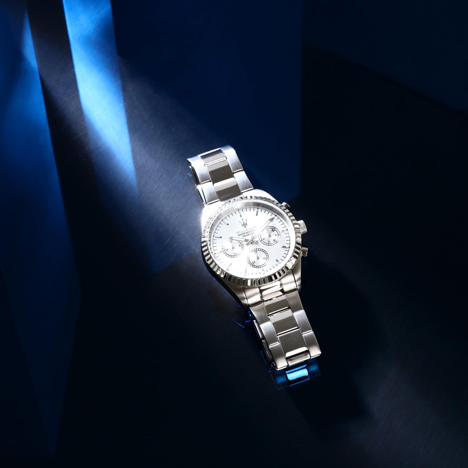 Maserati Men's Watch, ref. R8853100041, COMPETIZIONE Collection, in steel, quartz movement, multifunction function. The watch features a steel strap, with a hidden clasp. The watch case measures 43mm, surrounds a silver dial and mounts a resistant mineral glass. Water resistance up to 10 ATM. The watch is contained in its original packaging, with a 2-year warranty certificate.