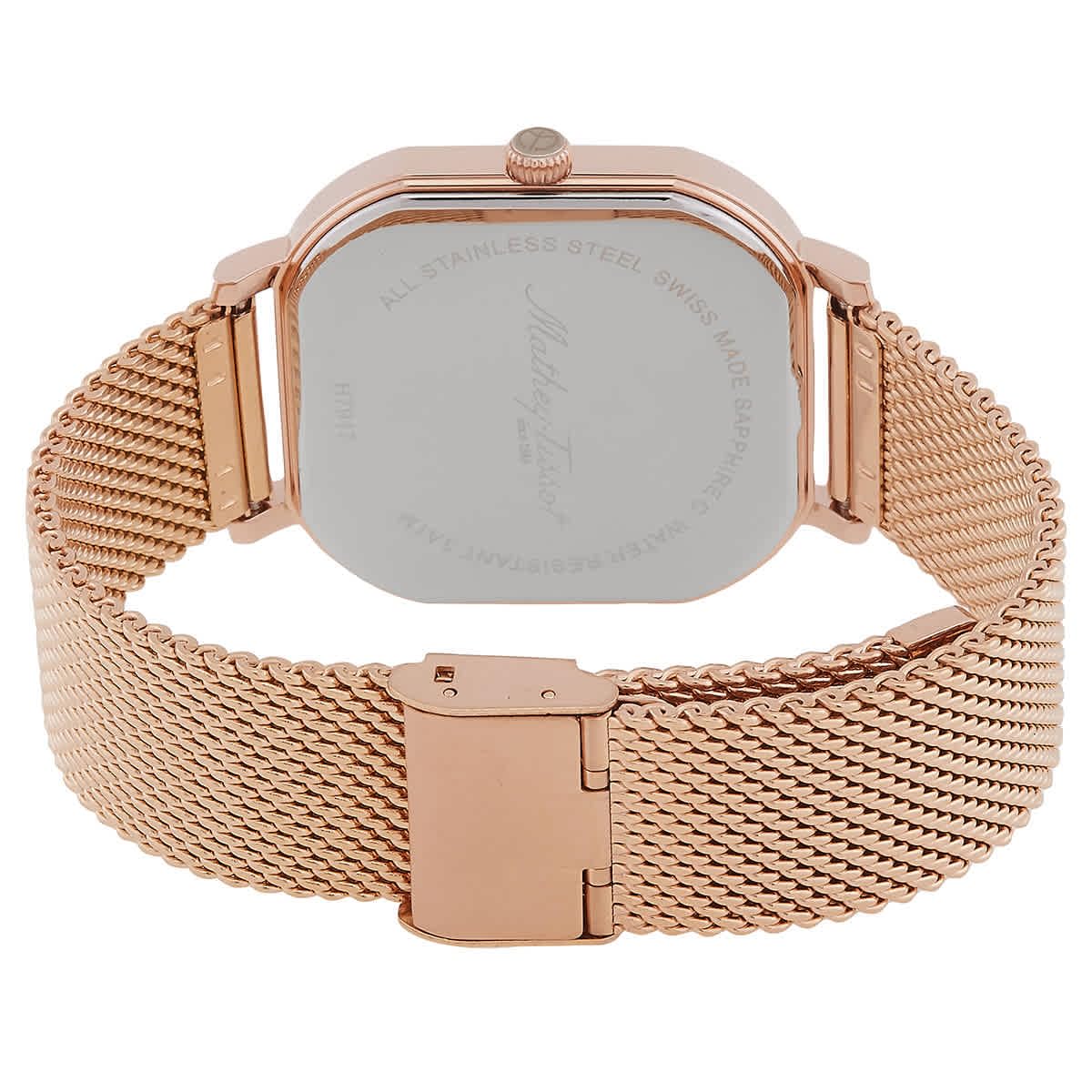 Stainless steel case with a stainless steel mesh bracelet. Fixed stainless steel bezel. Blue dial with Golden hands and index markers. Minute markers around the outer rim. Dial Type: Analog. hands and markers. Scratch resistant sapphire crystal.olid case back. Square case shape. Case size: 40 mm. Case thickness: 7 mm. Band width: 20 mm. Deployment clasp with a push button release. Water resistant at 50 meters.