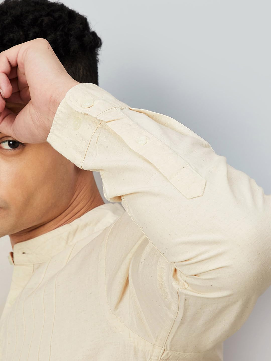 Max Men's Full Sleeves Mandarin Collar Solid Slim Fit Cotton Kurta Beige