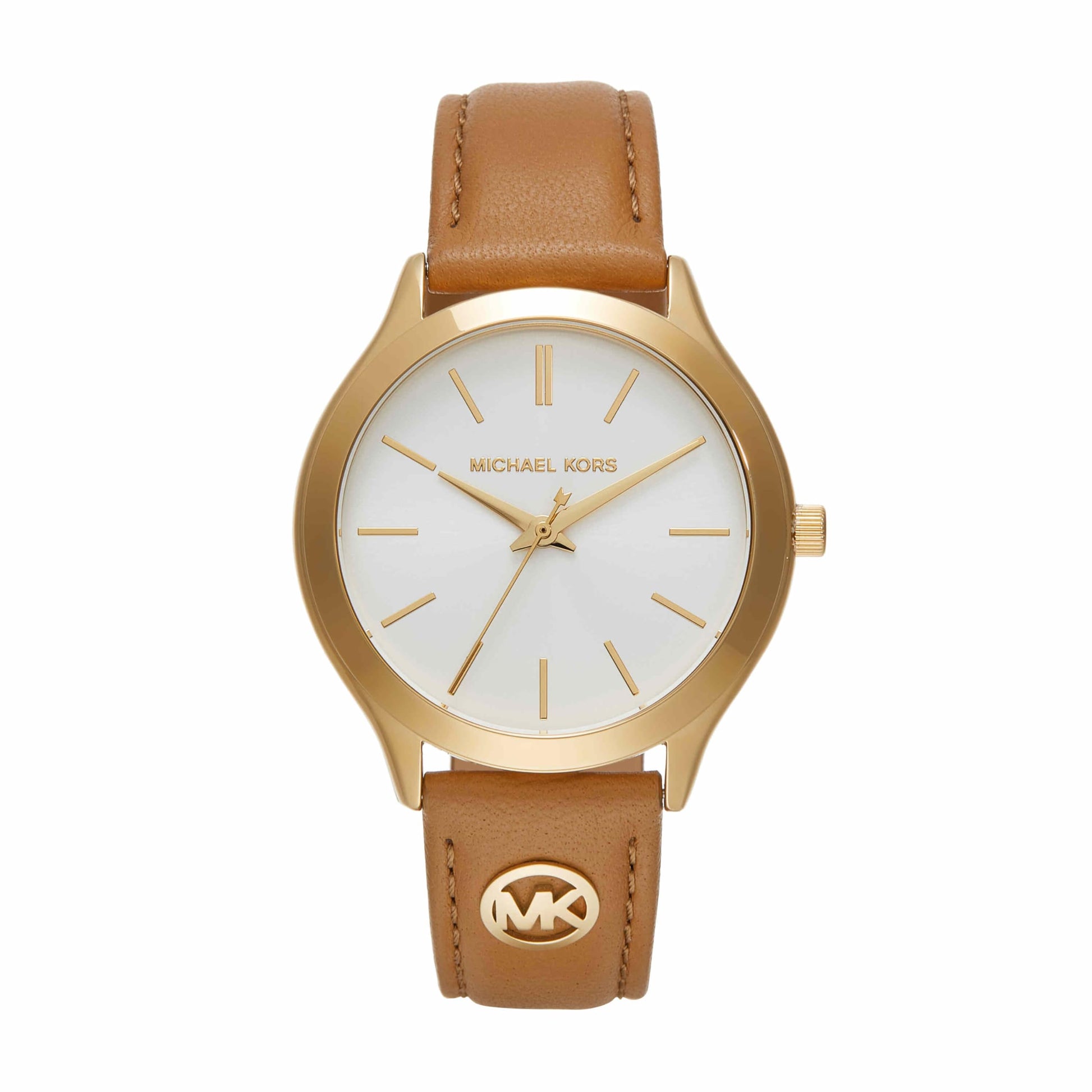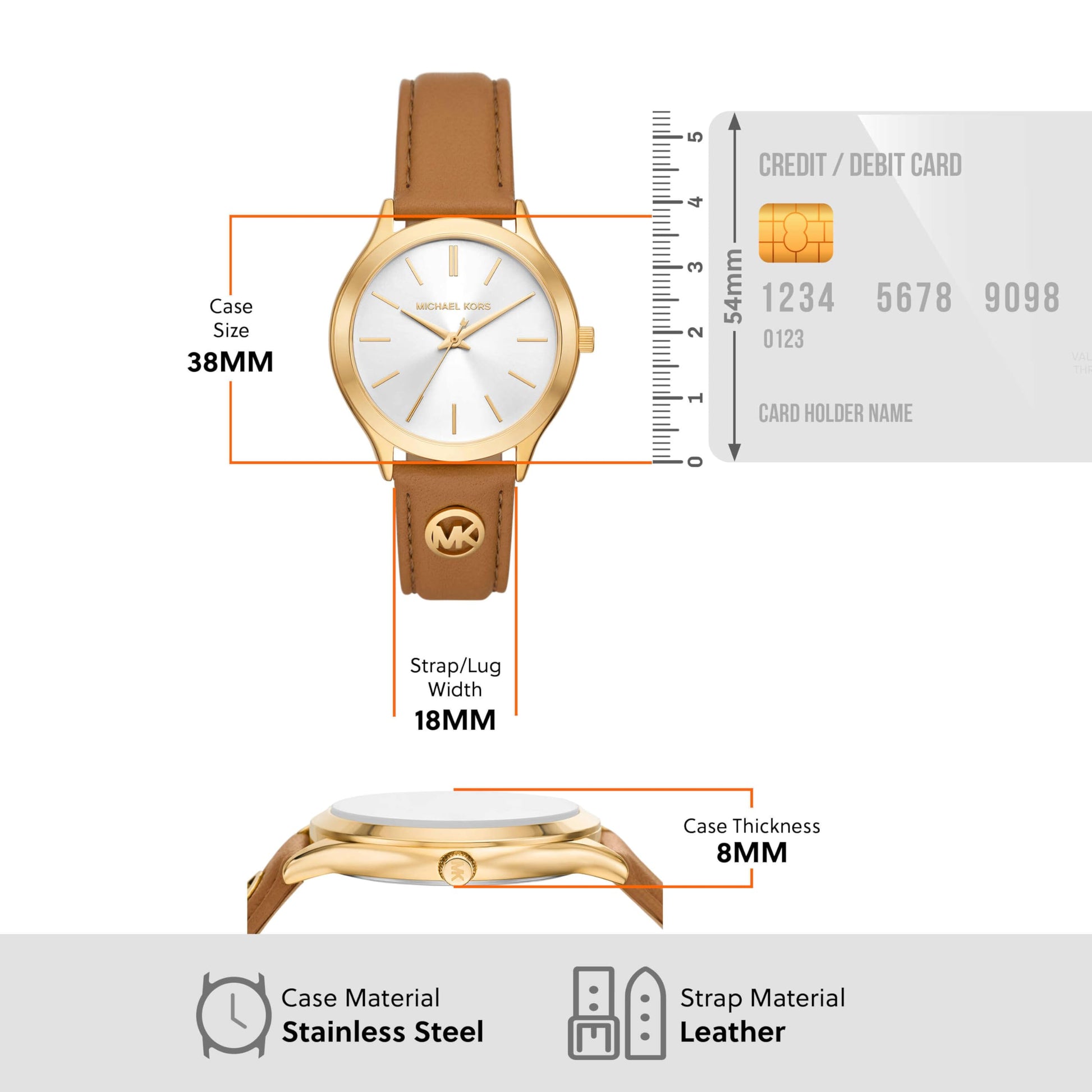 Details: Michael Kors' 38mm Slim Runway watch features a white sunray dial, three-hand movement and a luggage leather strap.