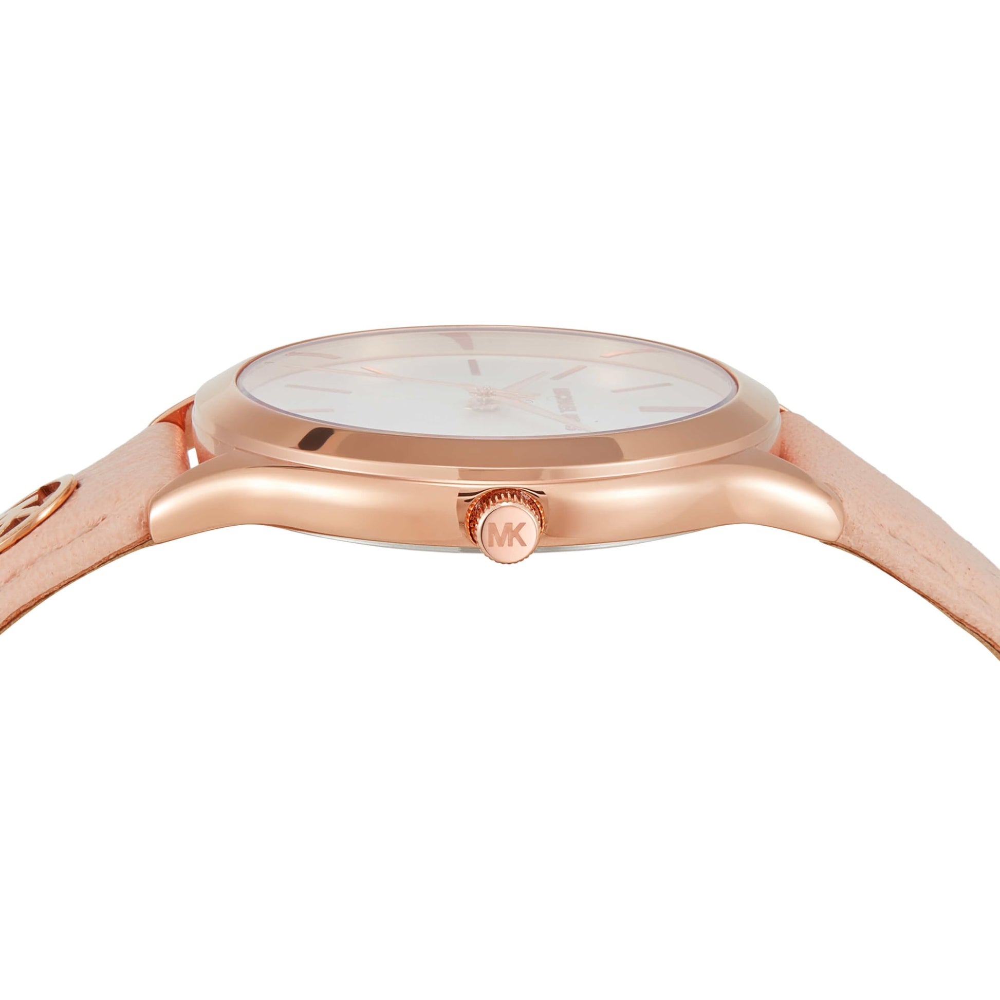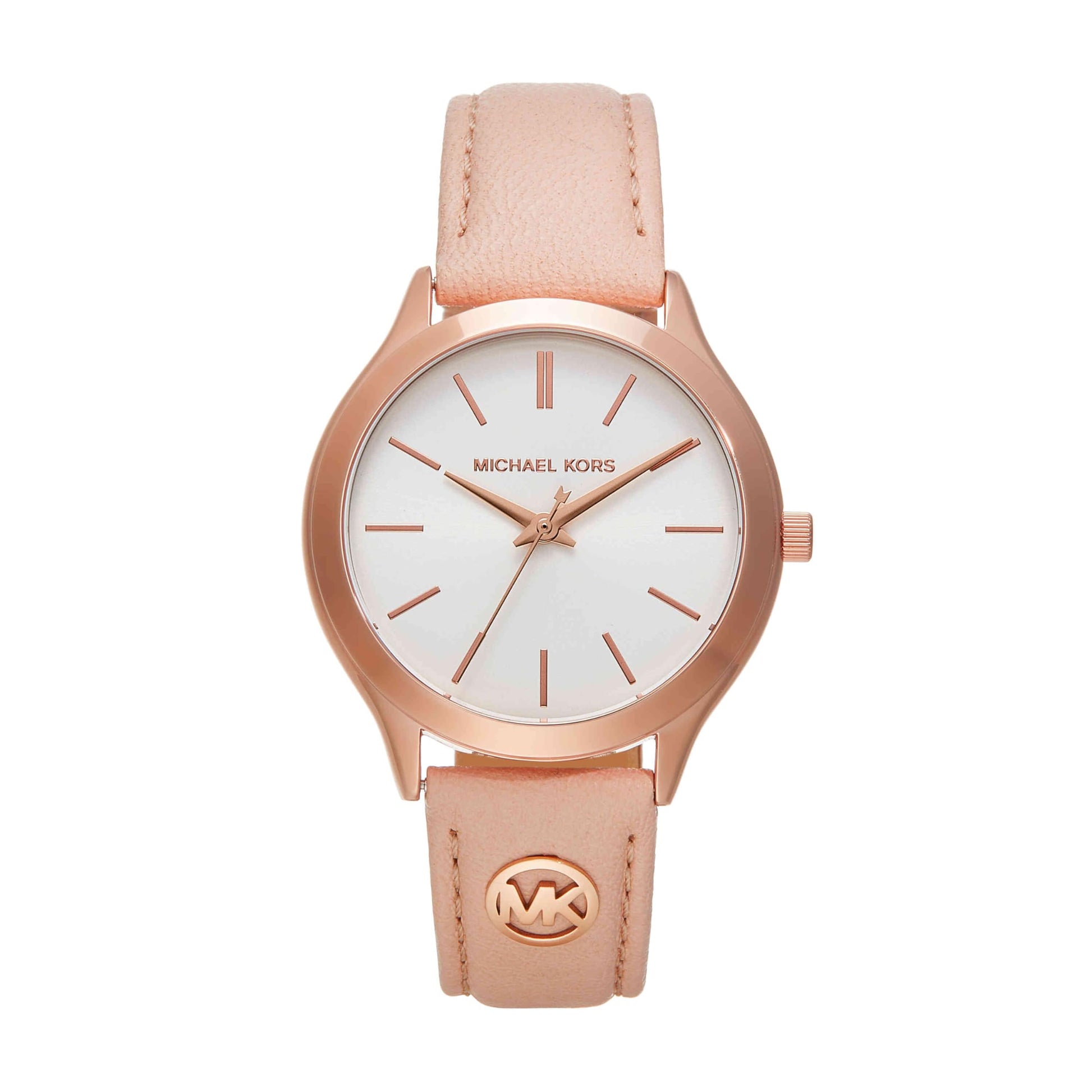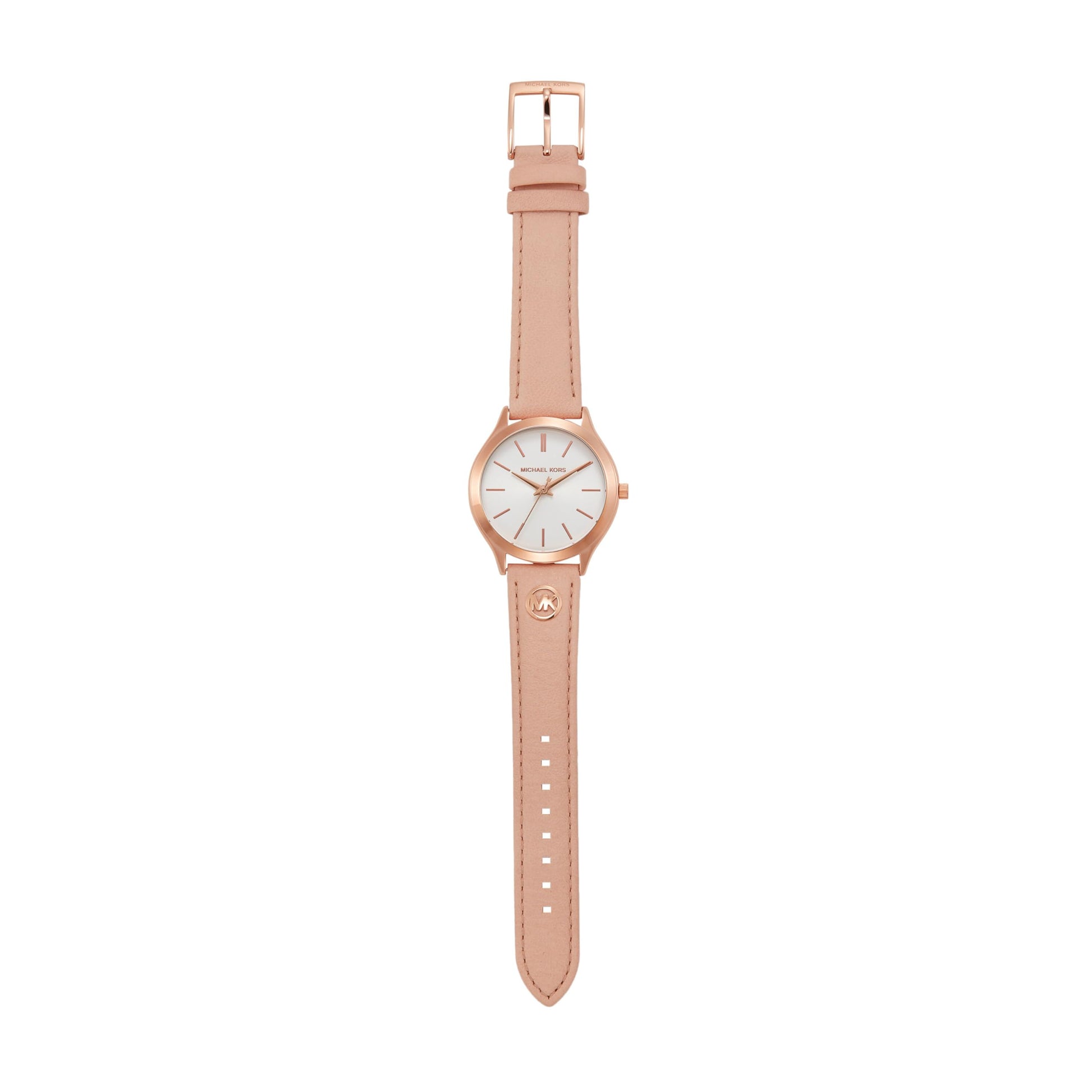 Michael Kors' 38mm Slim Runway watch features a white sunray dial, three-hand movement and blush leather strap.