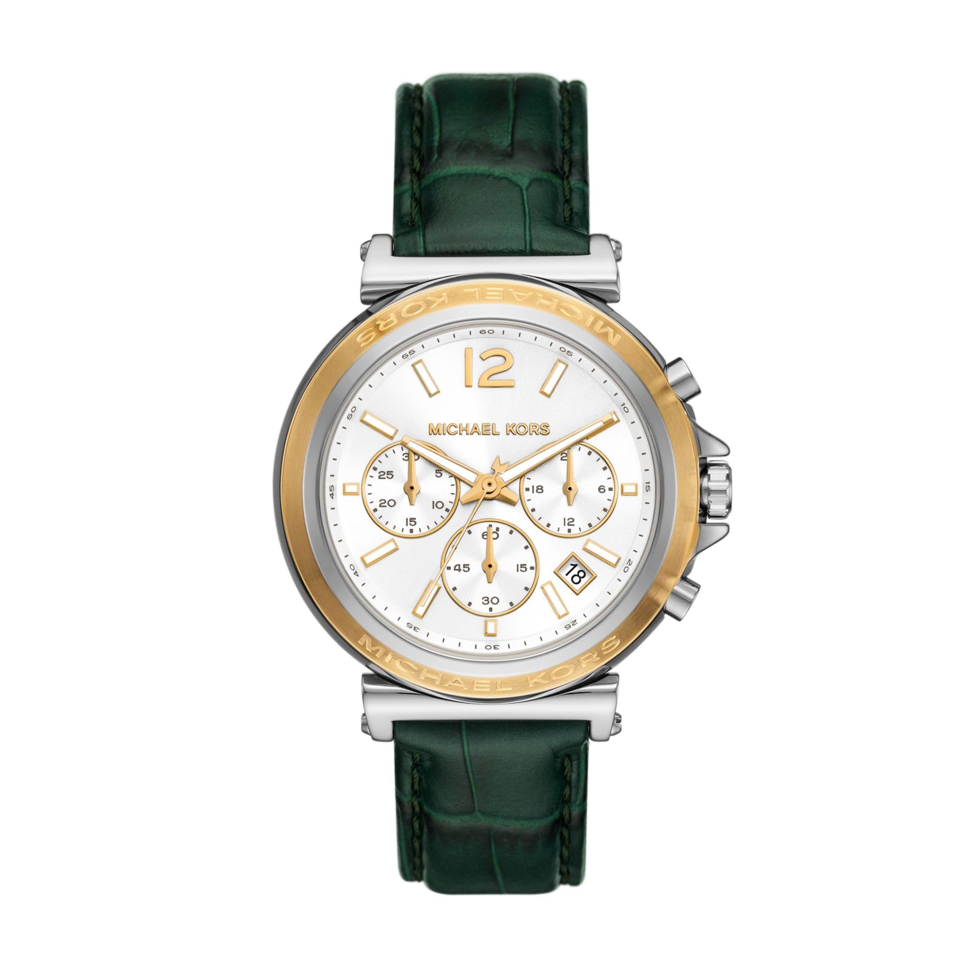 Michael Kors' 40mm Maren watch features a white sunray dial, chronograph movement and green croco embossed leather strap.