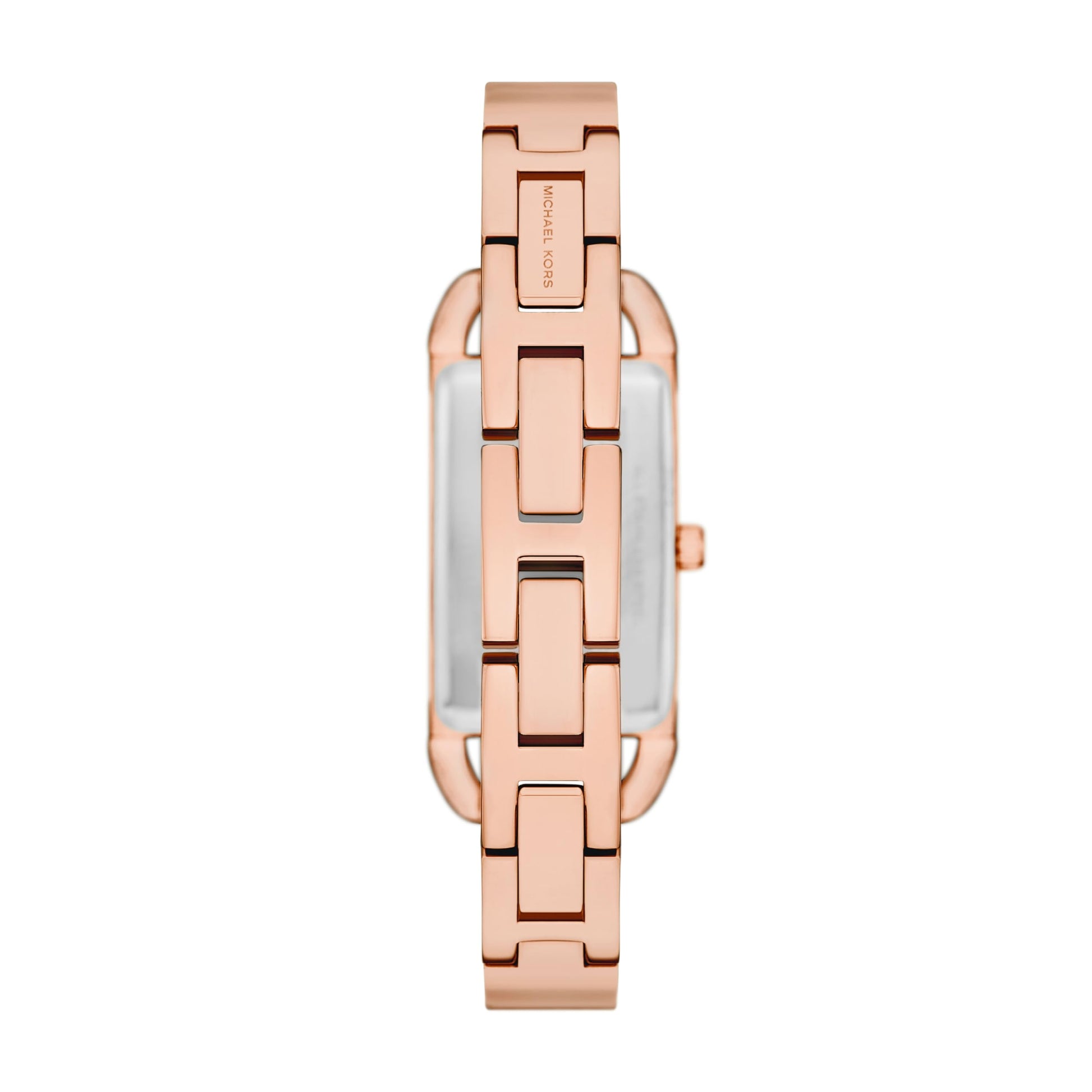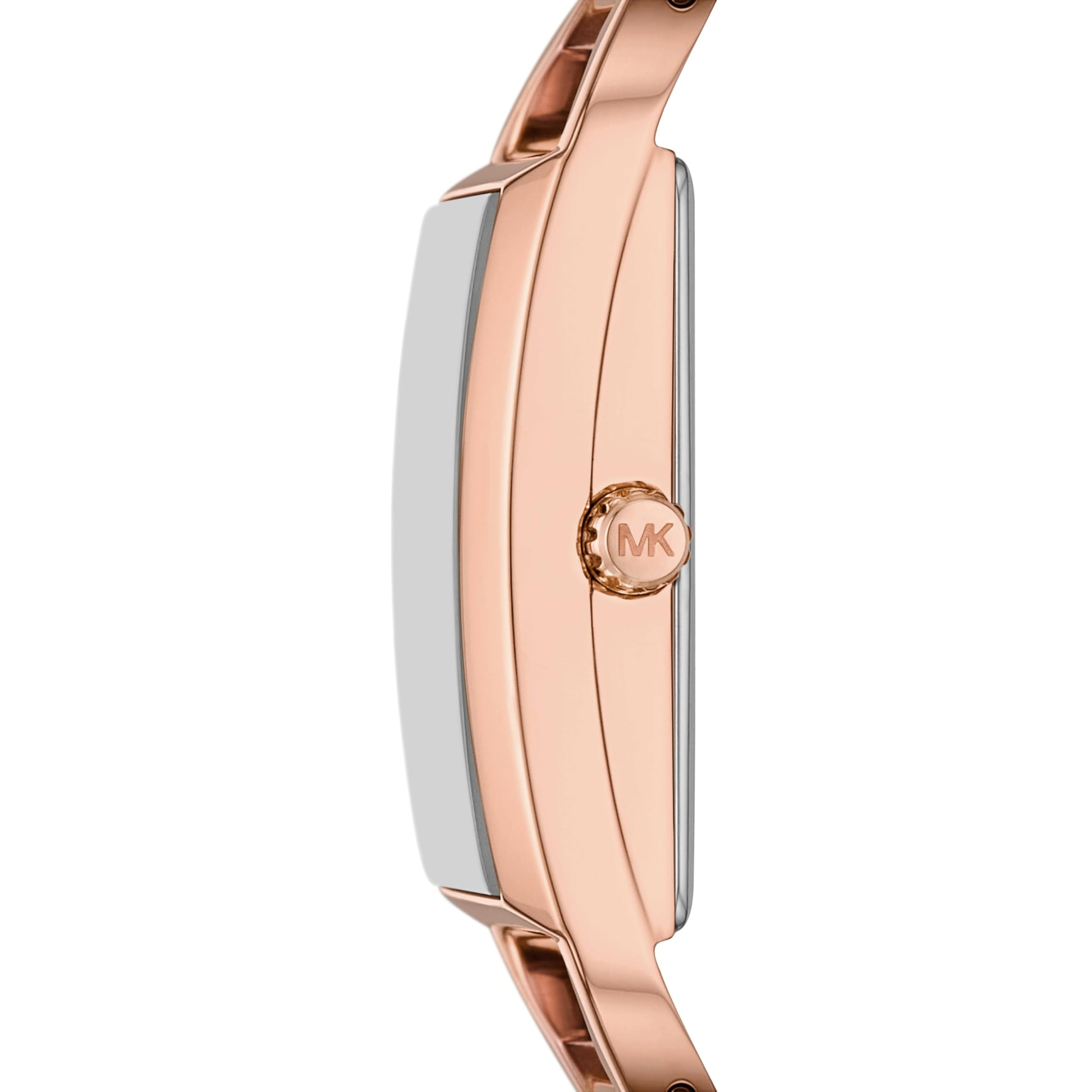 Michael Kors' 22mm MK Empire watch features a rose gold pavé dial, three-hand movement and rose gold-tone stainless steel bangle bracelet.