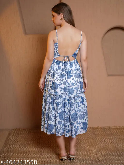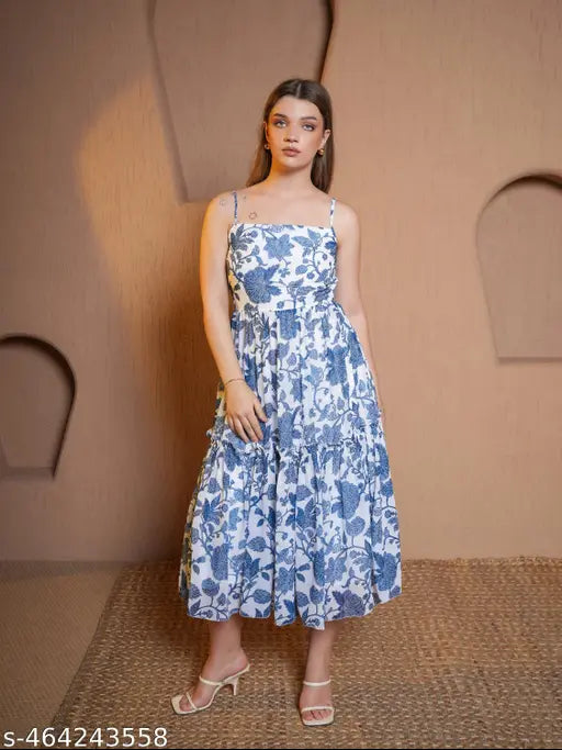 FabricGeorgette Polyester, Type Fit & Flare Dress, Neck Square Neck, Sleeve Sleeve less (Strap sleeve), Dress Length Below knee (45-inches), Product Content 1 Dress, Print Type Floral Print, Hemline Flared, Closer Type Elastic, Surface style RufflesLayersGathers