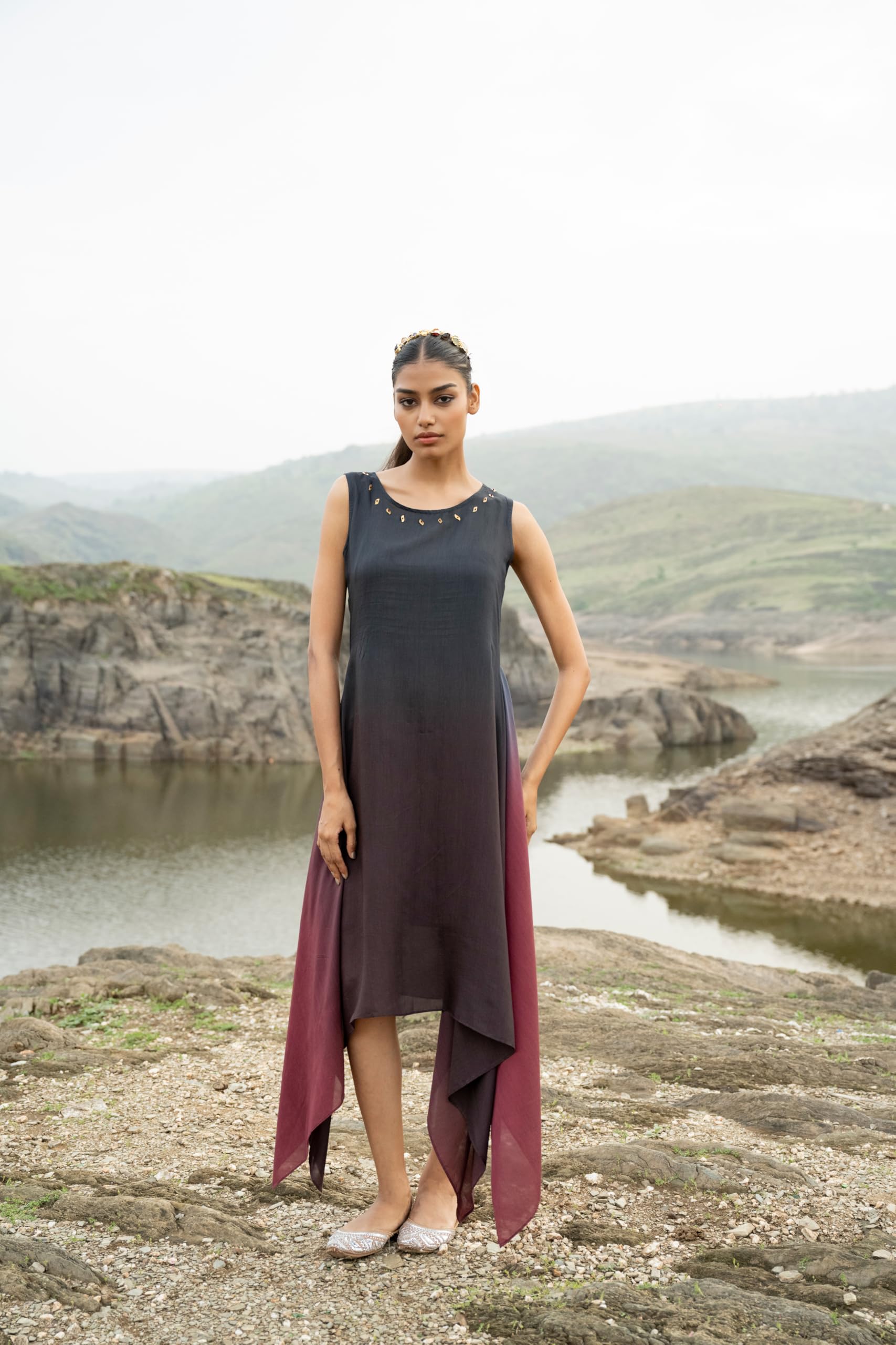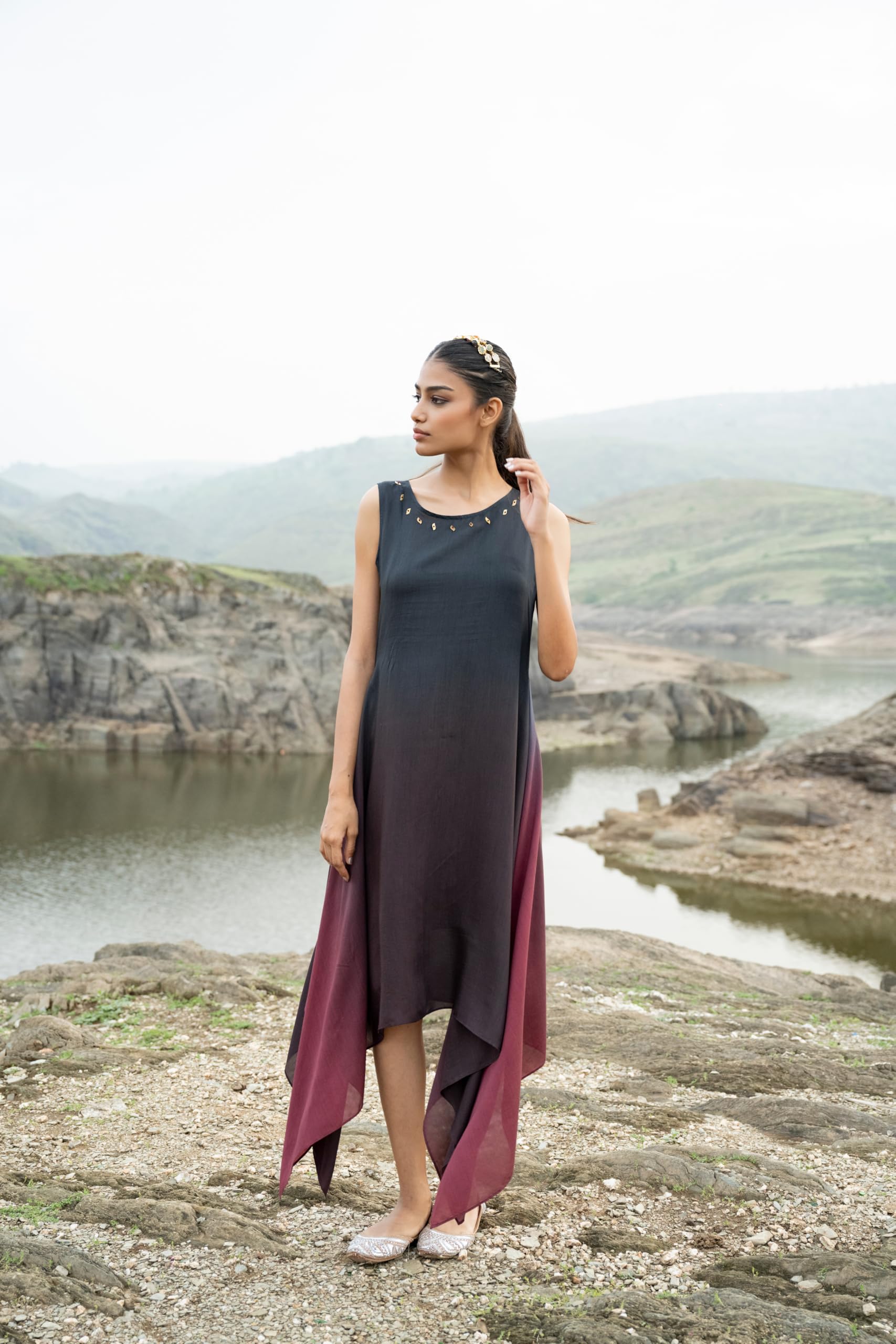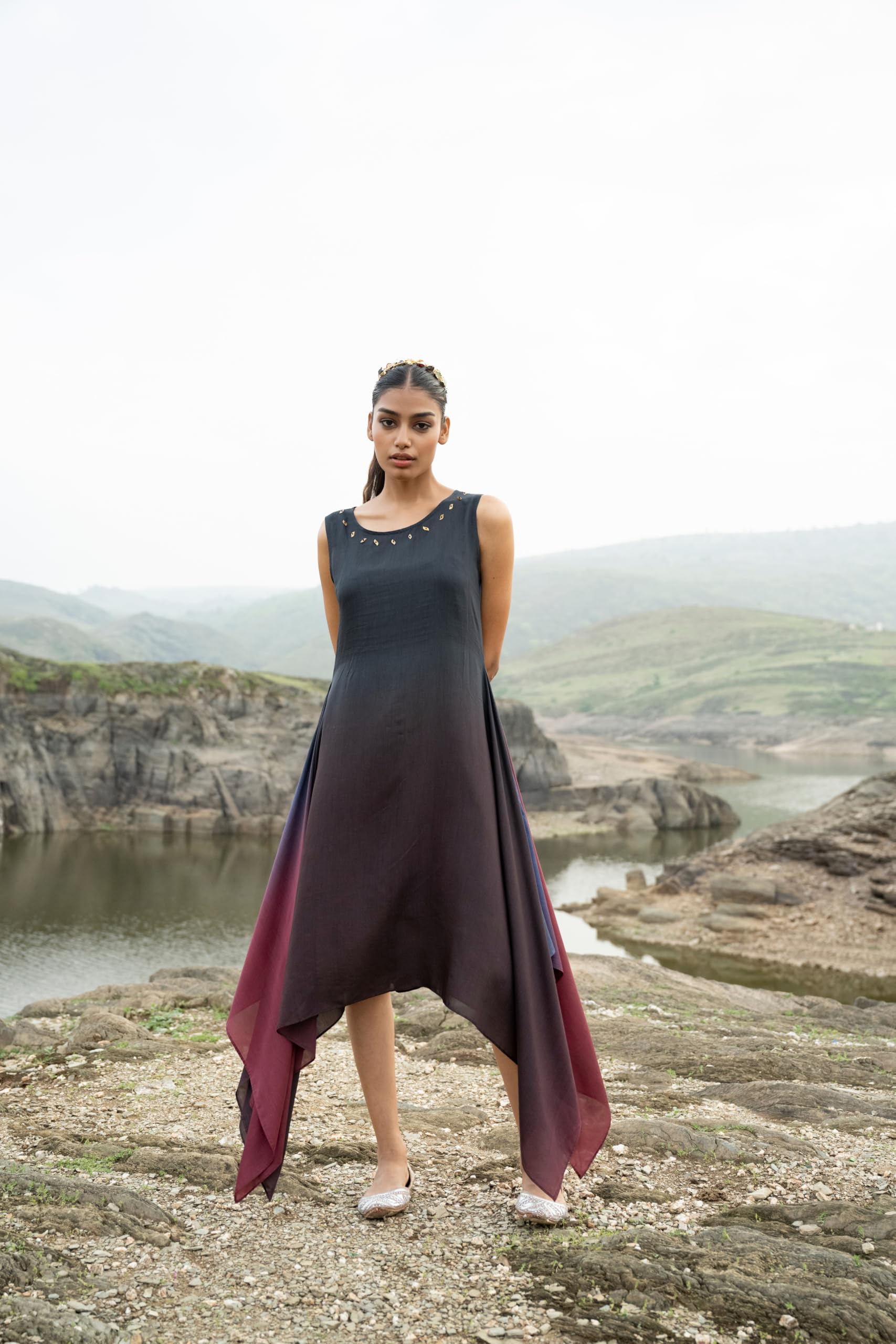 - ABOUT THE PRODUCT: Style: Ethnic Dress| Design: Sleeveless| Fabric: Pure Muslin Modal| Colour: Midnight Blue to Burgundy Ombre| Embroidery: Hand Embroidered in Metal Sequence and Thread Knot Work