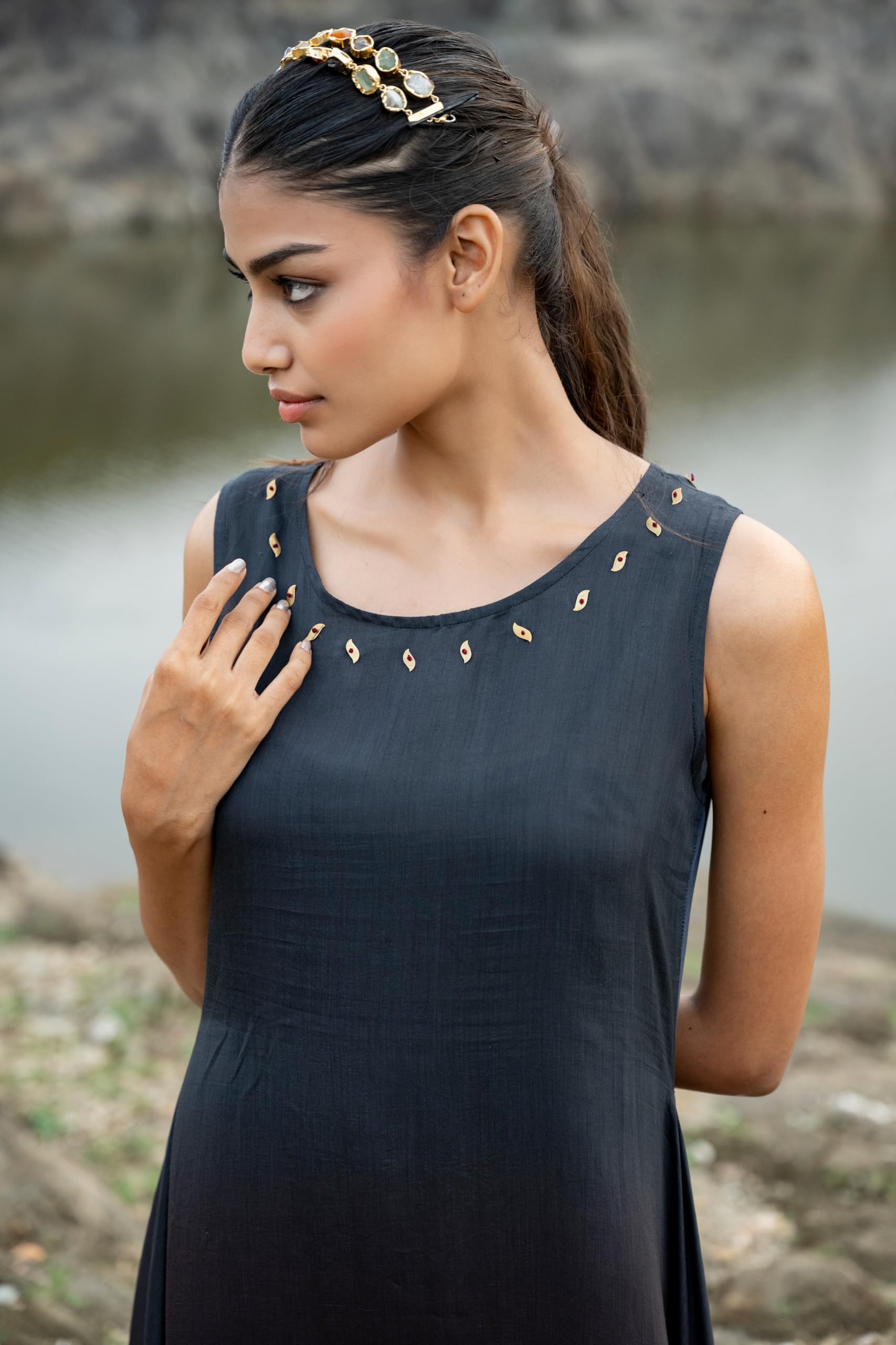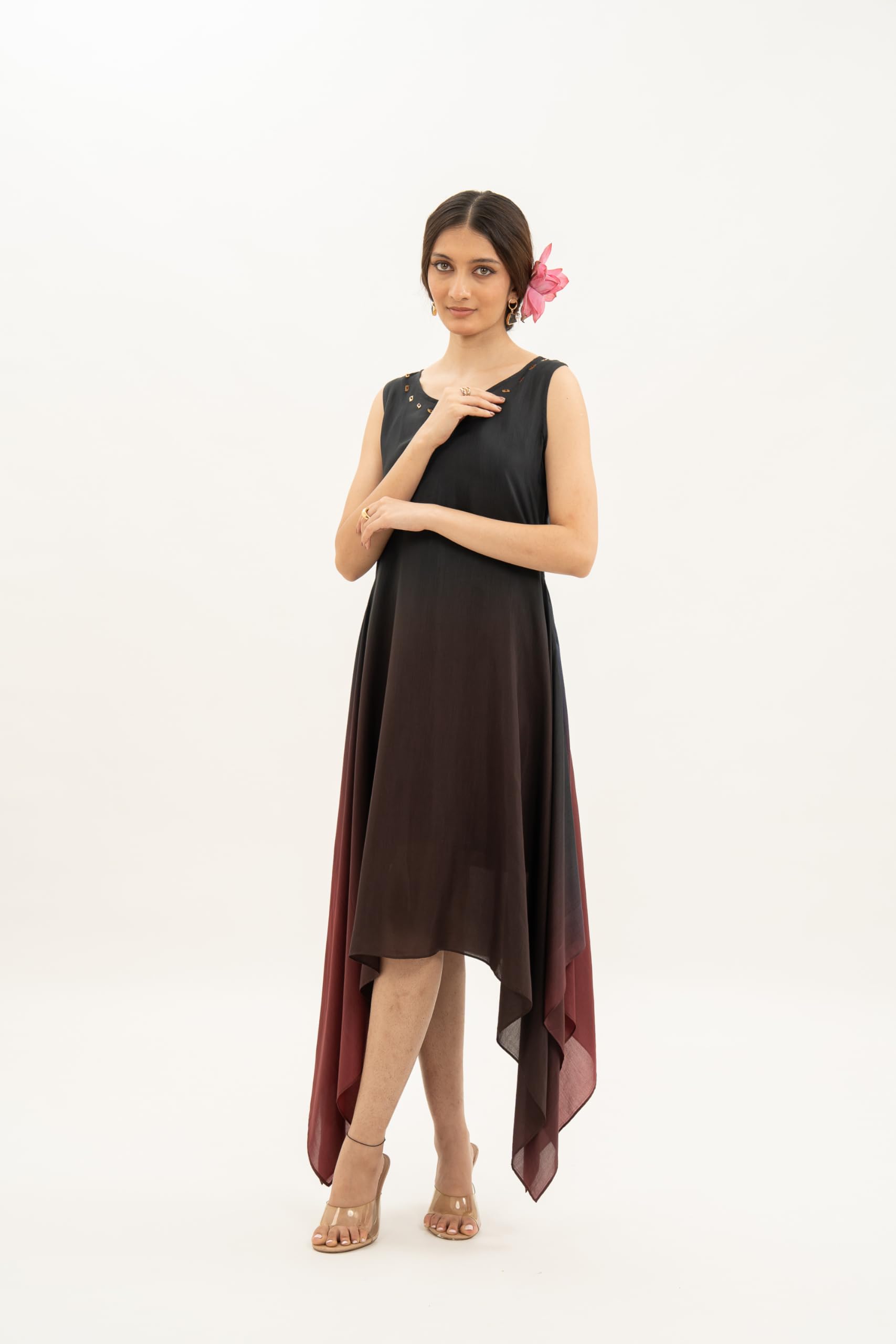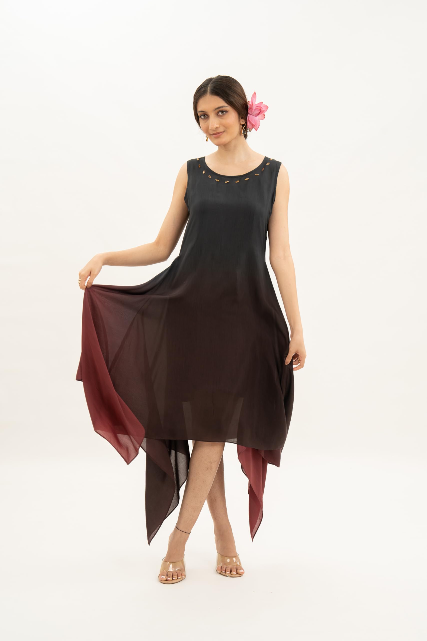 - ABOUT THE PRODUCT: Style: Ethnic Dress| Design: Sleeveless| Fabric: Pure Muslin Modal| Colour: Midnight Blue to Burgundy Ombre| Embroidery: Hand Embroidered in Metal Sequence and Thread Knot Work