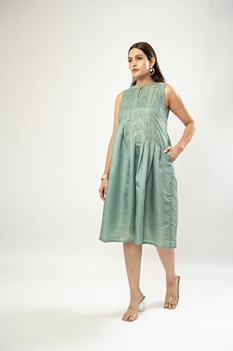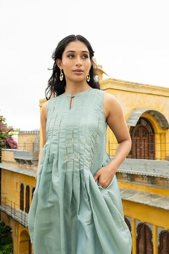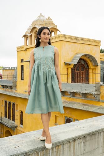 - ABOUT THE PRODUCT: Style- Mini Dress | Length- Mid Calf | Type of sleeve- Sleeveless | Neck-Round | Style- Ethnic Dress | Colour- Powder Blue