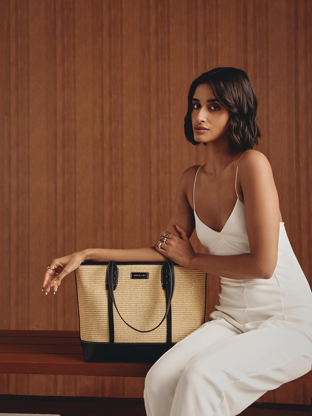 Vienna’s the kind of girl who boards flights in linen sets and never loses her boarding pass. With a raffia exterior, braided tassel straps, and contrast thread detail, she gives sunkissed luxury no matter the season. The roomy interior, laptop sleeve, and zippered pocket make her perfect for café hopping in a new city or powering through emails by the beach. From workcations to weekend escapes, Vienna carries it all—gracefully.