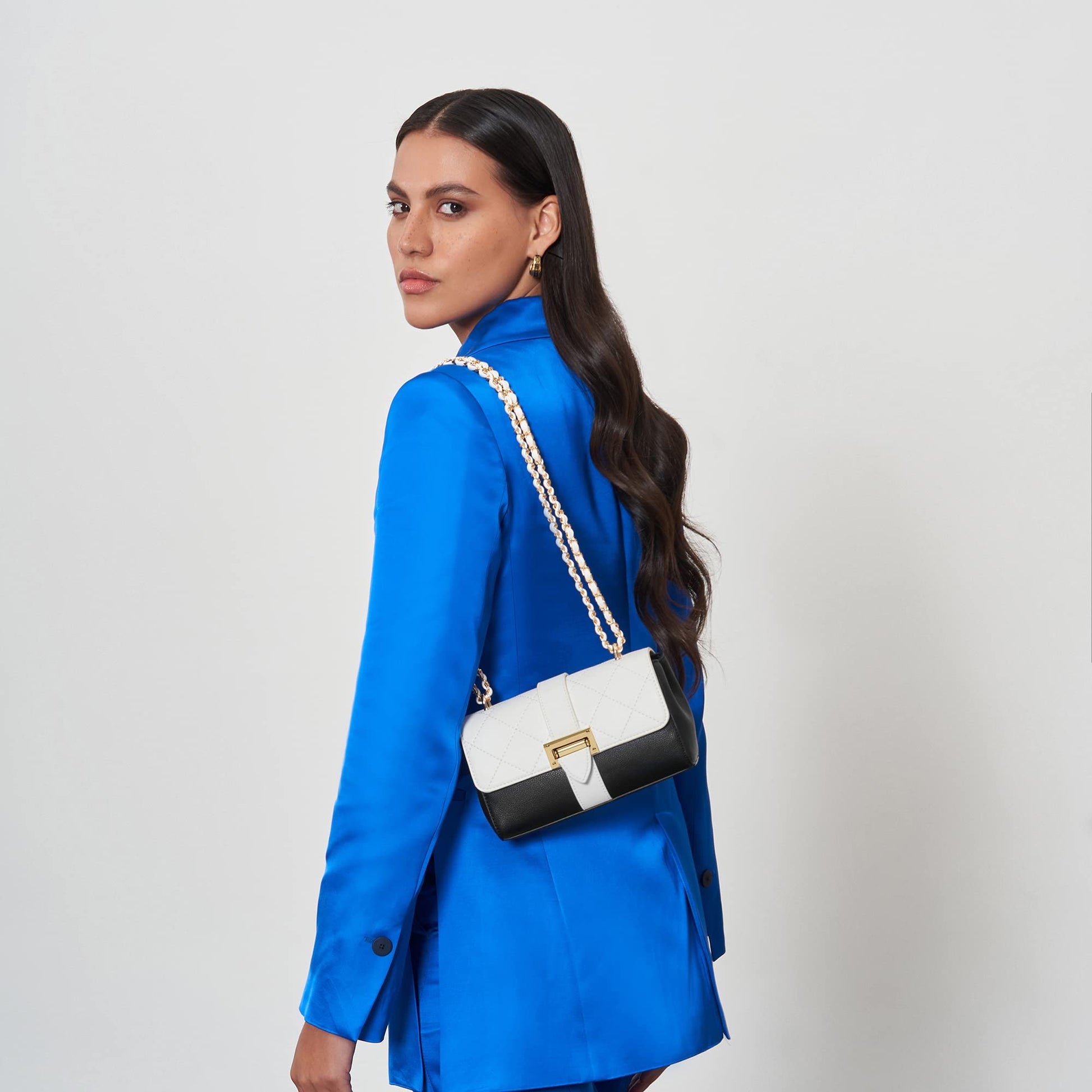 Details: Make a glamorous entrance at your next soiree with Estelle Crossbody Bag. The spacious interior provides ample space to store your daily essentials, while the gold-toned twist-lock closure and chain embellishments bring an unexpected allure to your wardrobe. This quilted bag is a perfect addition to any woman's collection.
