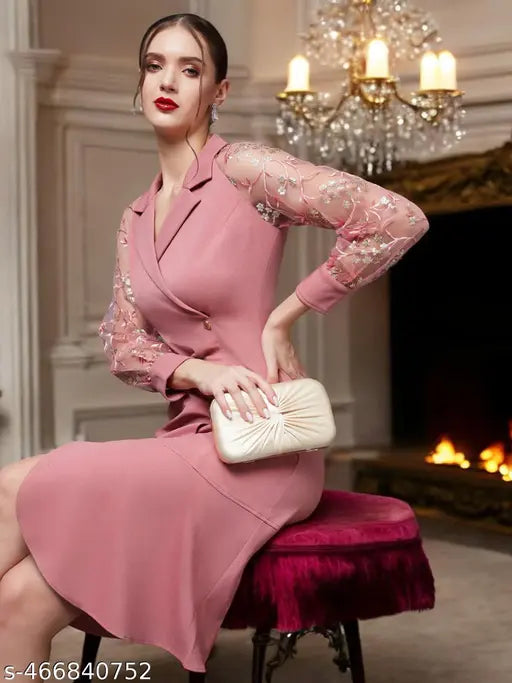 Dusty Pink & Golden Polyester Solid Embroidered Double Breasted Knee Length Dress. Has a Notch Collared V-neck and Sheer Full Sleeves. Has ruffled hems
