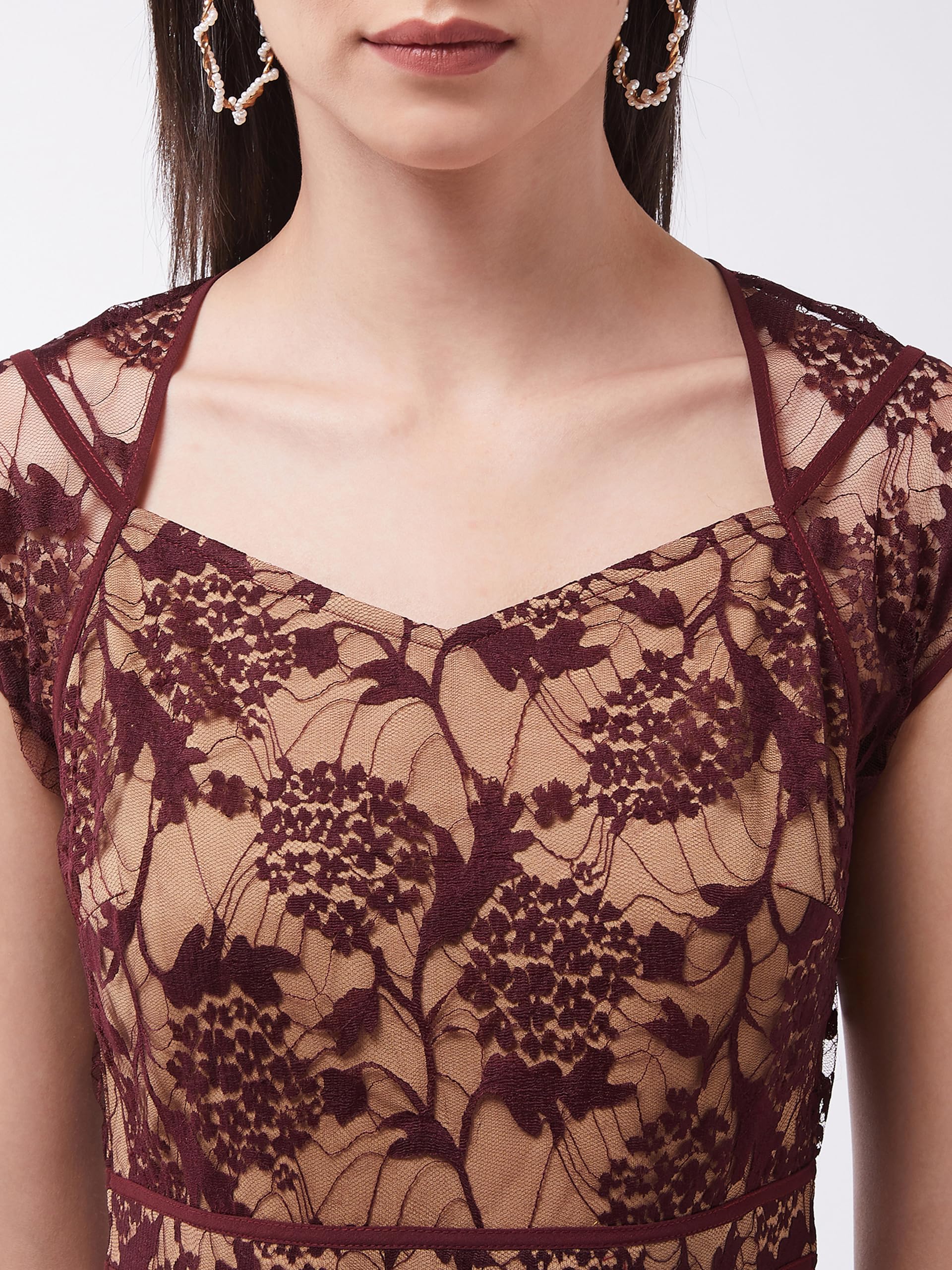 Miss Chase Women's Floral V - Neck Cap Short Sleeves Lace Overlaid Fit & Flare Paneled Maxi Dress (MCSS21D06-11-603-04,Wine & Beige,M)