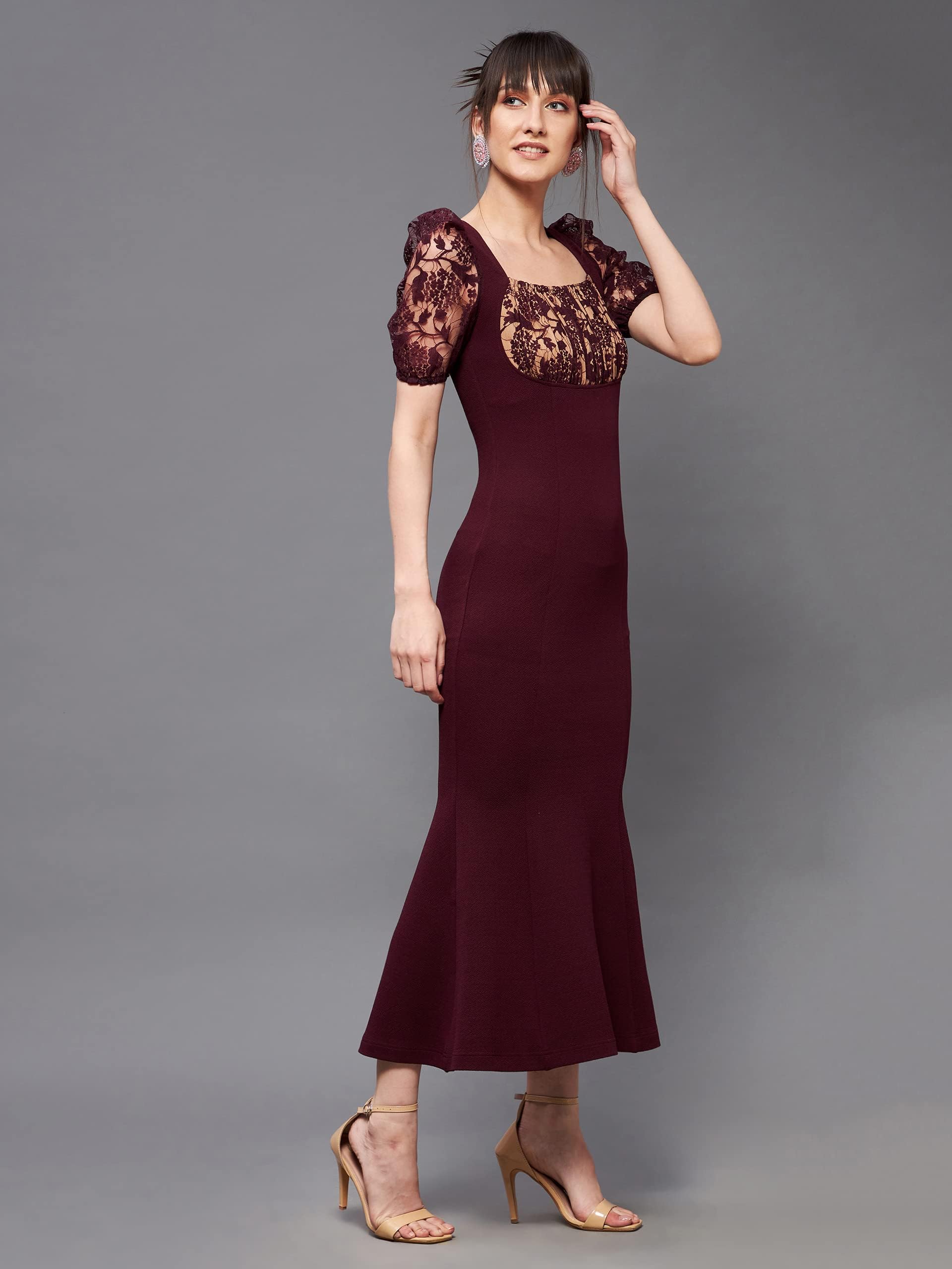 Miss Chase Women's Square Neck Short Puff Sleeve Self Design Lace Overlaid Bodycon Midi Dress (MCSS23D79-01-184-02, Wine, XS)