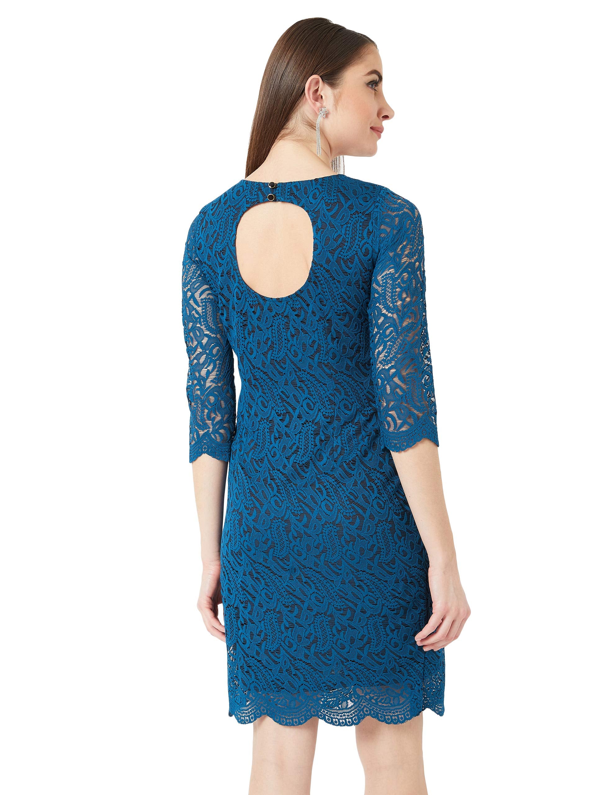 Miss Chase Women's Teal Round Neck 3/4 Sleeves Floral Lace Overlaid Knee-Long Bodycon Dress with Zip Closure(MCAW19D14-32-83-04, Teal, Medium)