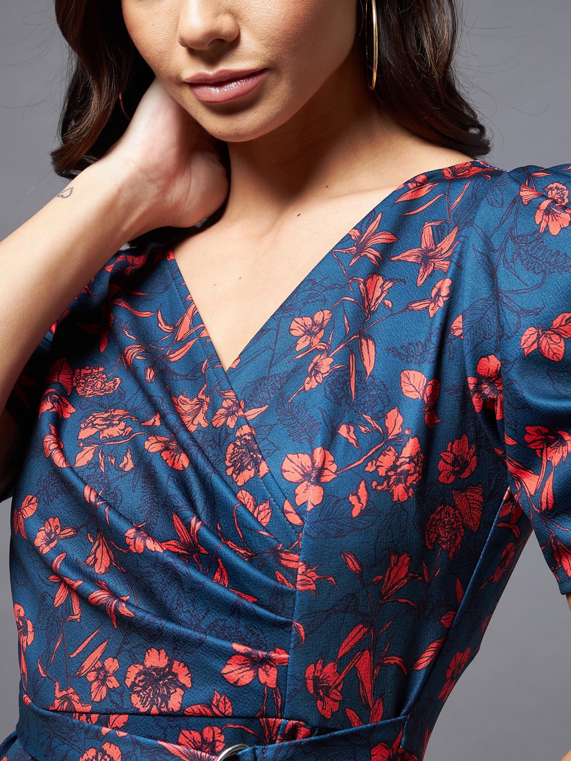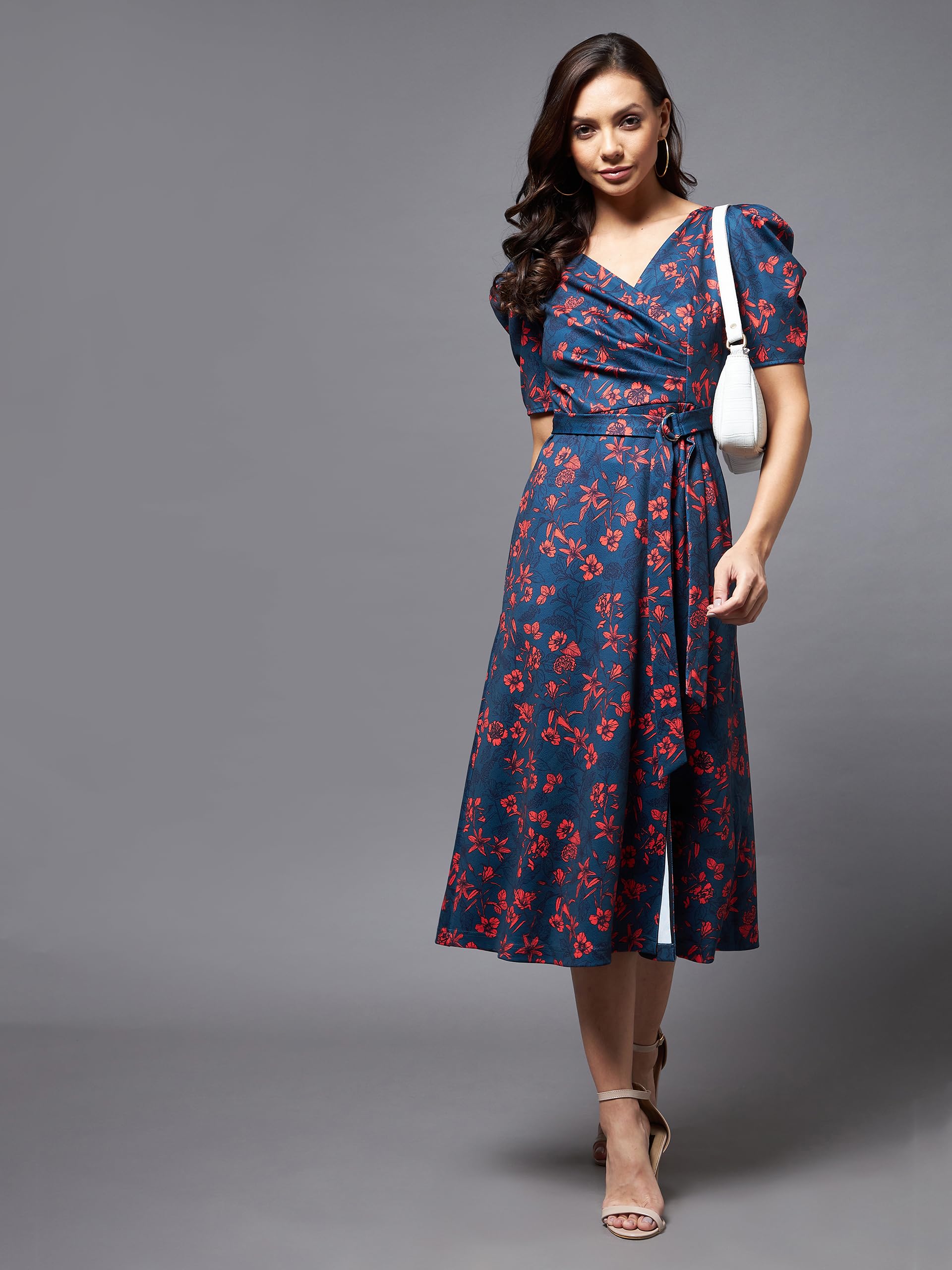 - Style: Wrap | Pattern: Floral | Neck: V-neck | Sleeves: Half Sleeve | Length: Midi | Fit: Slim Fit