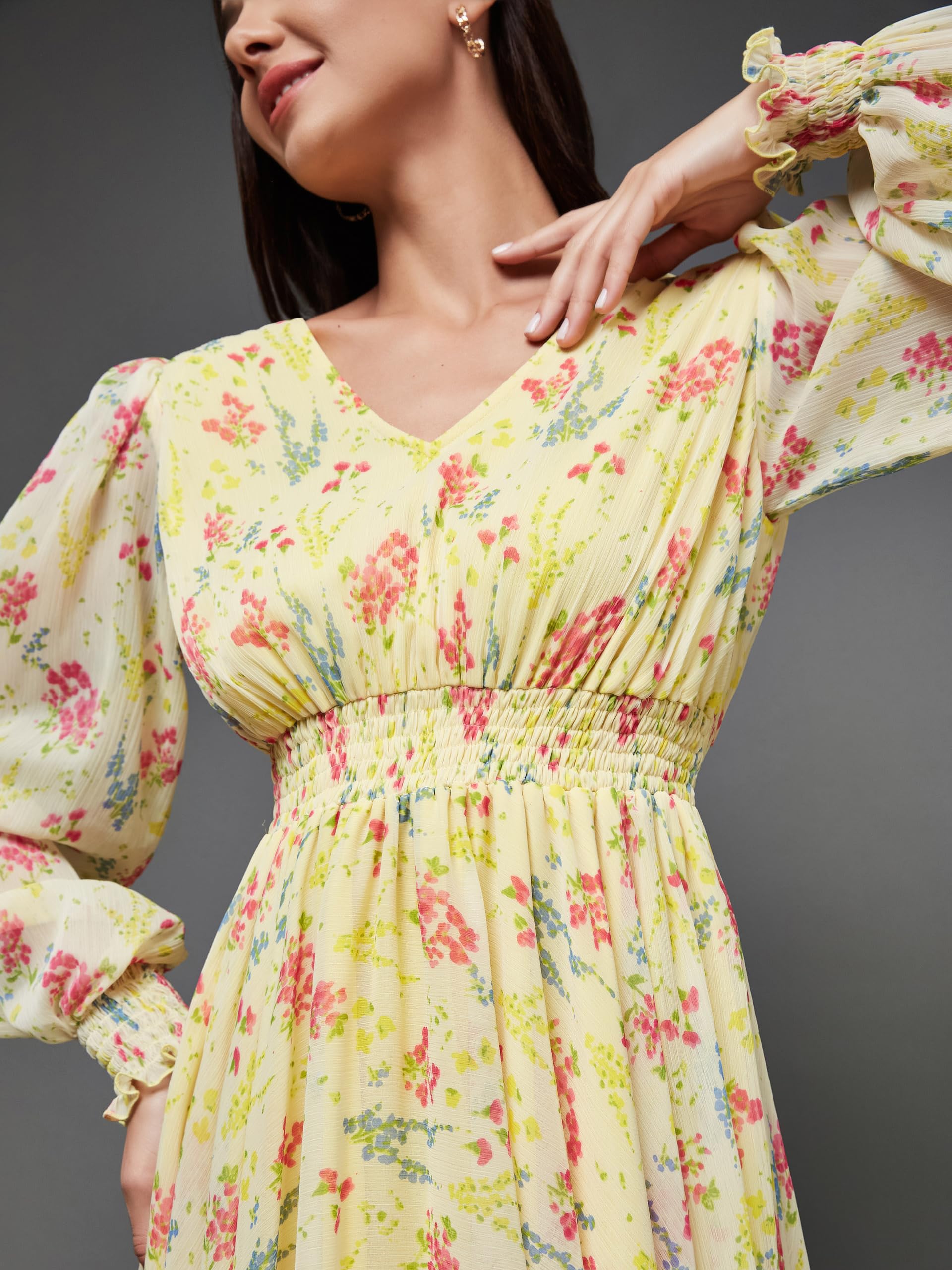 Miss Chase Women's V-Neck Bishop Sleeve Floral Gathered Chiffon Maxi Dress (MCSS23D06-65-278-05, Multicolored-Base-Lime Yellow, L)