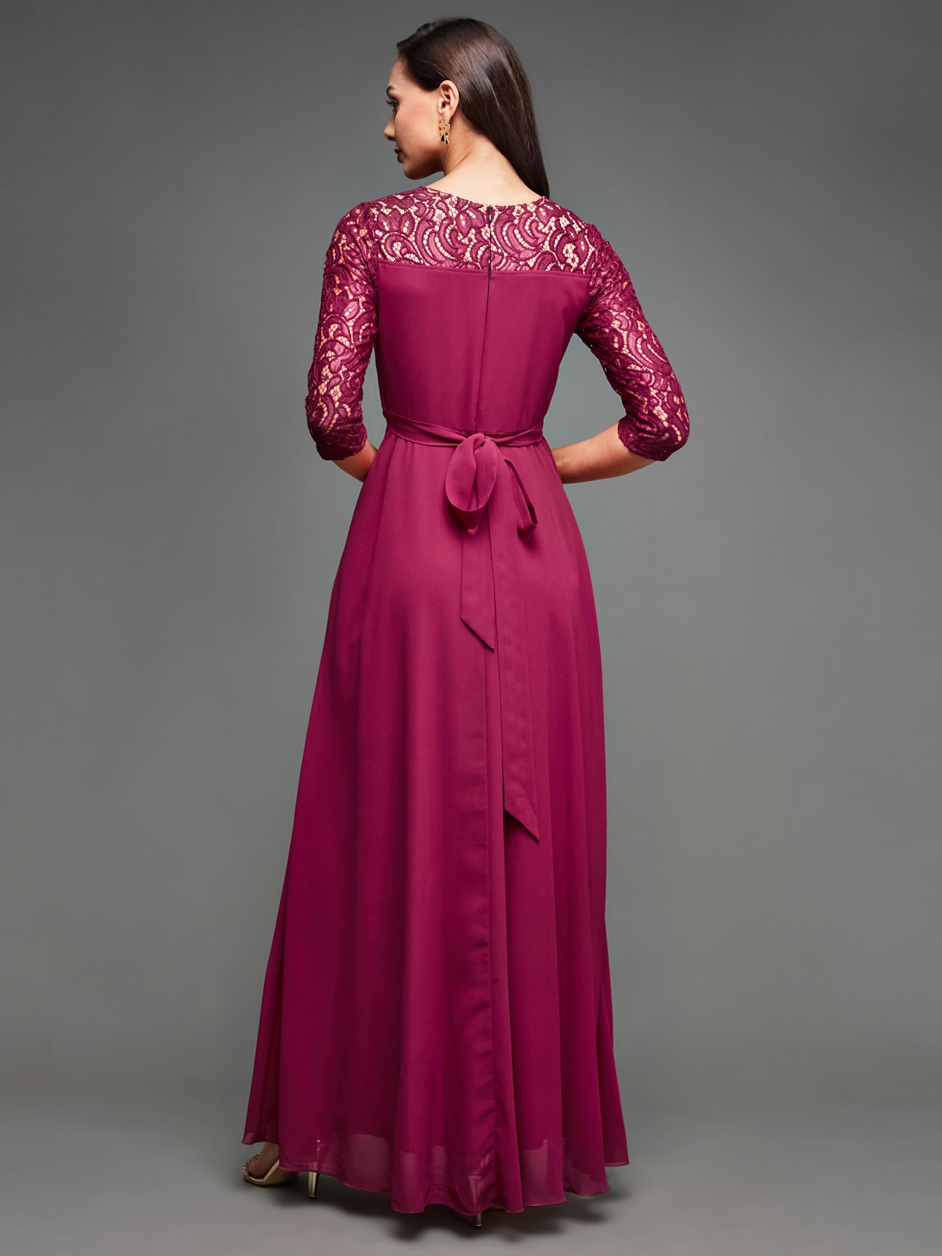 Miss Chase Women's V-Neck Three-Quarter Sleeve Self-Designed Wrap Maxi Georgette Dress (MCSS23D98-60-23-03, Dark Pink, S)