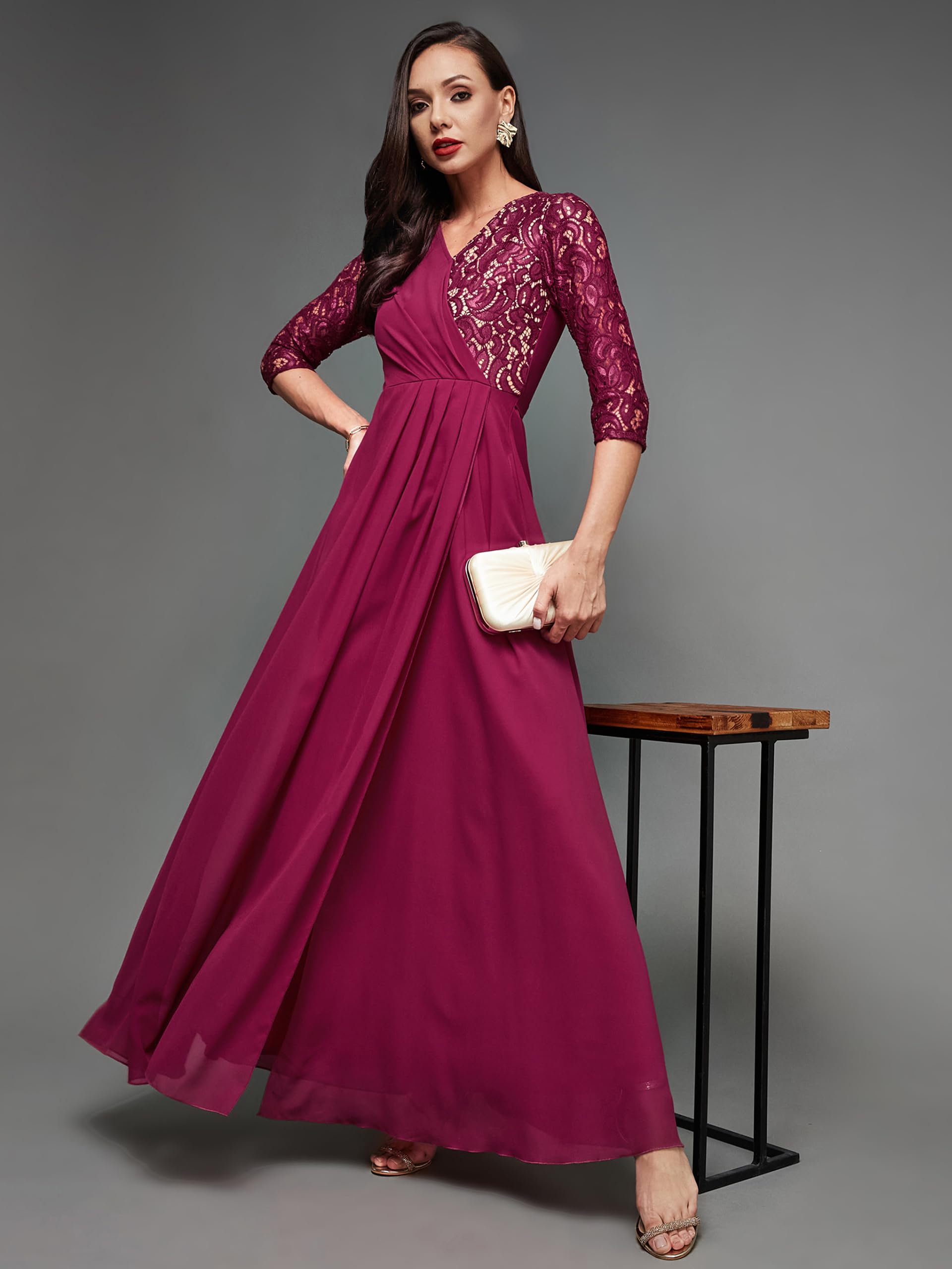 - Style: Wrap | Pattern: Lace Ovelaid | Fit: Relaxed Fit | Neck: V-Neck | Sleeves: Lace Overlaid | Closure: Zip | Length: Maxi | Pockets: Yes, 2 Side Pockets