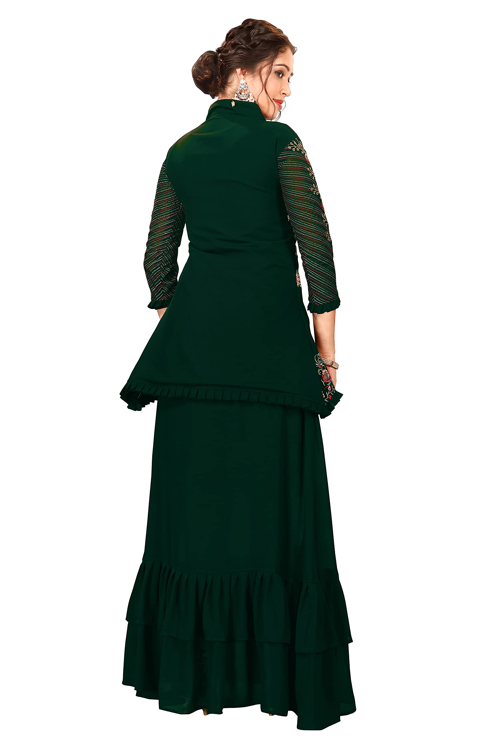 Top Details : , Color : Green , Top Fabric : Faux Georgette , Sleeves Fabric : Faux Georgette , Top Stitching Type : Semi Stitched , Top Inner Fabric : Santoon , Top Work : Solid , Top Length : 58 Inch , Top Bust Size : Free (Up to 48 Inch) , Top Type : Flared Top (Semi Stitched), Product Type : Gown , Jacket Details : , Jacket Fabric : Faux Georgette , Jacket Work : Embroidered , Jacket Length : 28 Inch