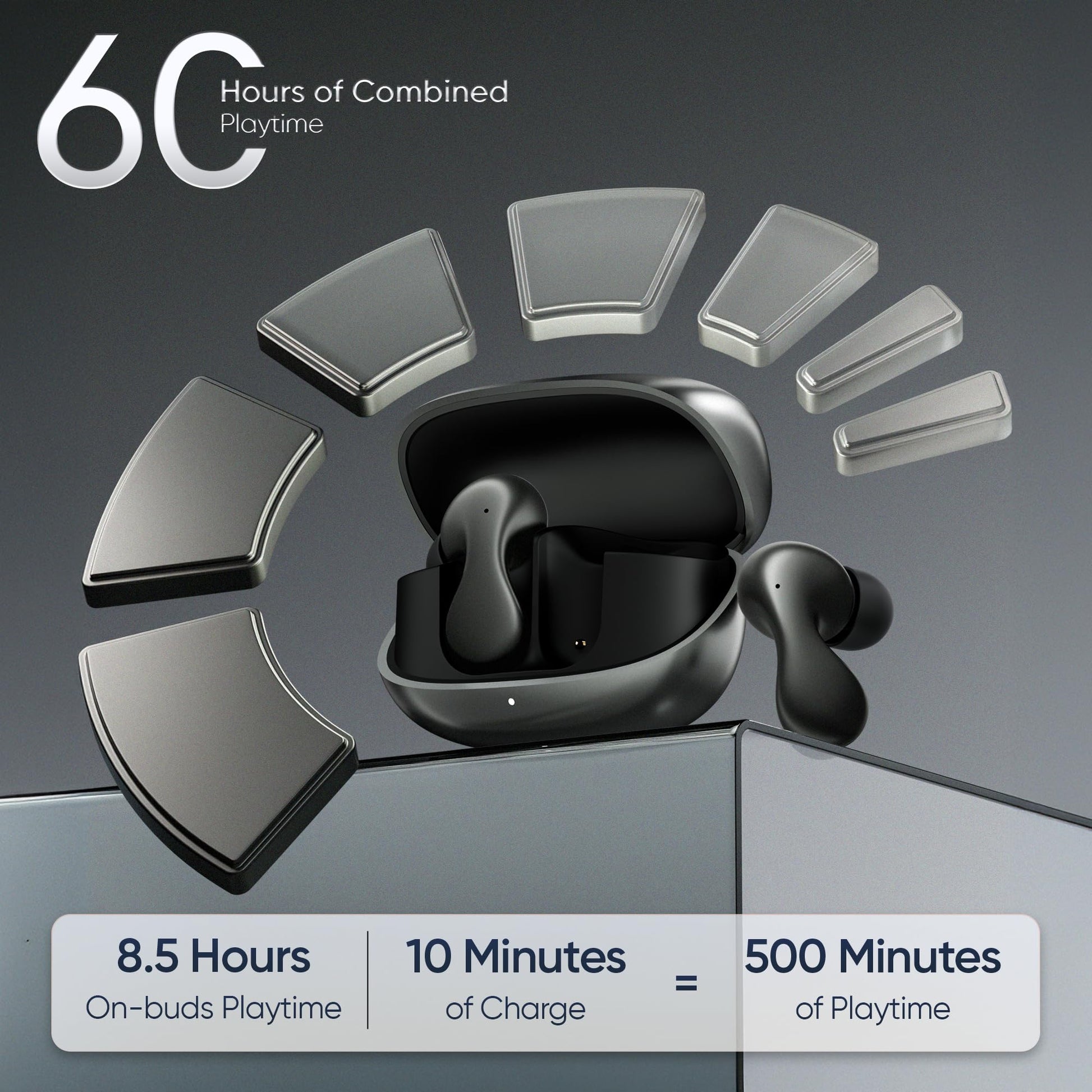 - ✅ Battery & Playtime: It provides 8.5 Hrs of on-bud playtime and 60 Hrs of combined playtime. With just 10 minutes of charging, enjoy 500 minutes of playtime. The fast charge of these SuperPods comes with Type C charging.