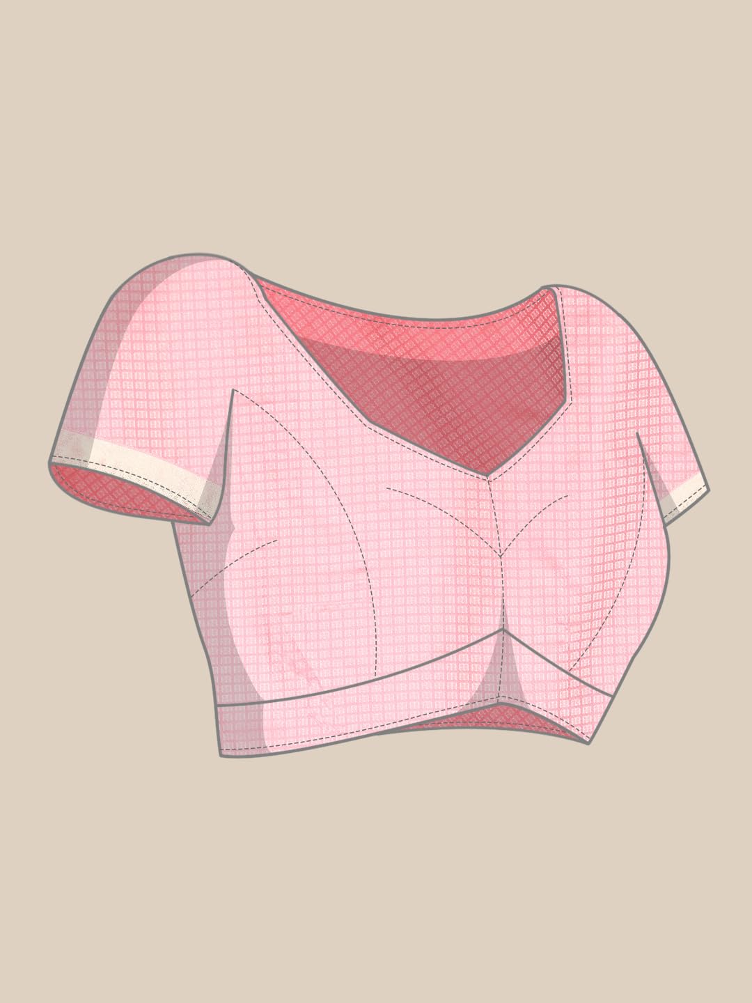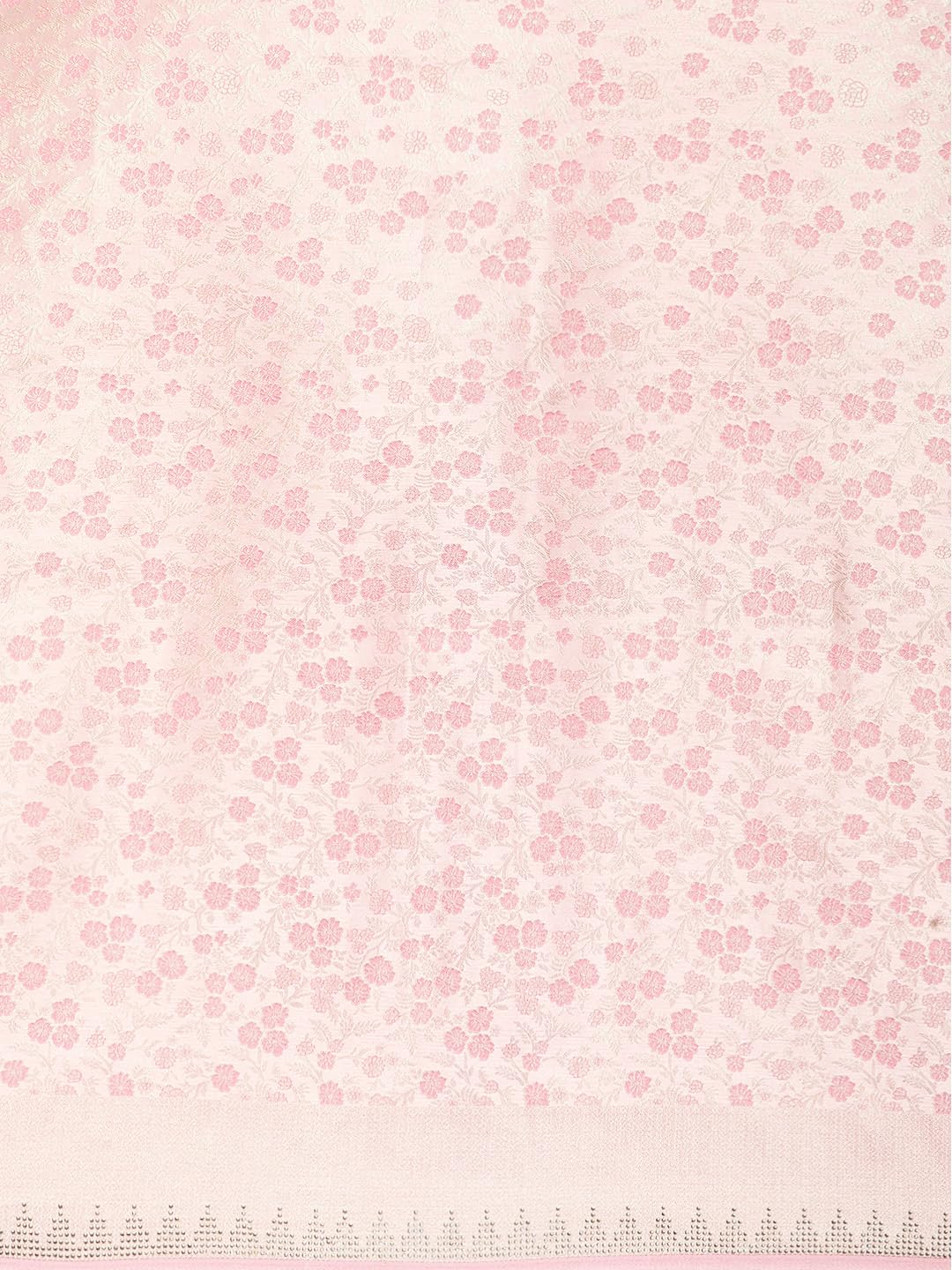 - Design: Featuring a floral pattern created with silver zari work, the cherry blossom pink saree exudes a delicate charm. The saree is further embellished with a diamante stone work border, adding an element of sparkle and sophistication. The cherry blossom pink hue of the saree complements the silver zari and diamante stone work, making it a perfect choice for elegant gatherings and celebrations. Style it with traditional silver jewellery and metallic silver heels.