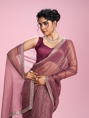 MOHEY Women's Organza Stone Work Saree with Blouse Piece(Purple)