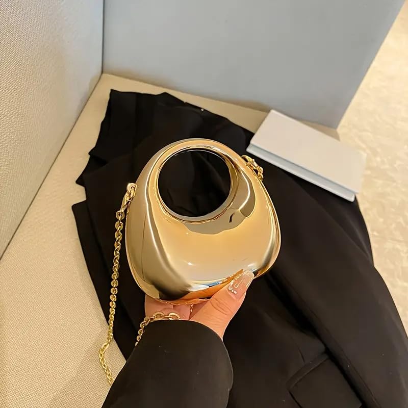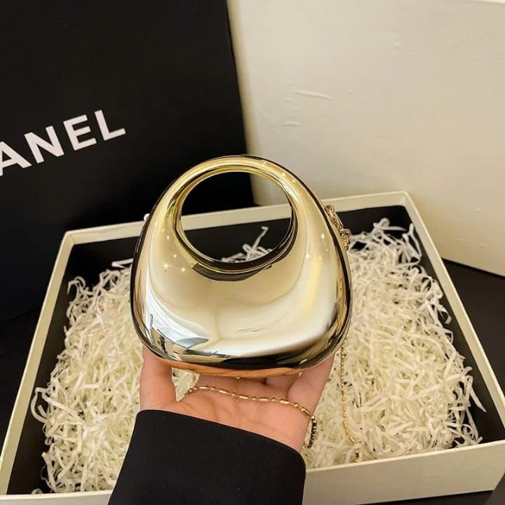 - ✨ Unique Crescent Design : Crafted with a sleek moon-shaped structure, this glossy metallic acrylic handbag is a showstopper. box clutch is crafted from high-quality acrylic with a glossy metallic finish.