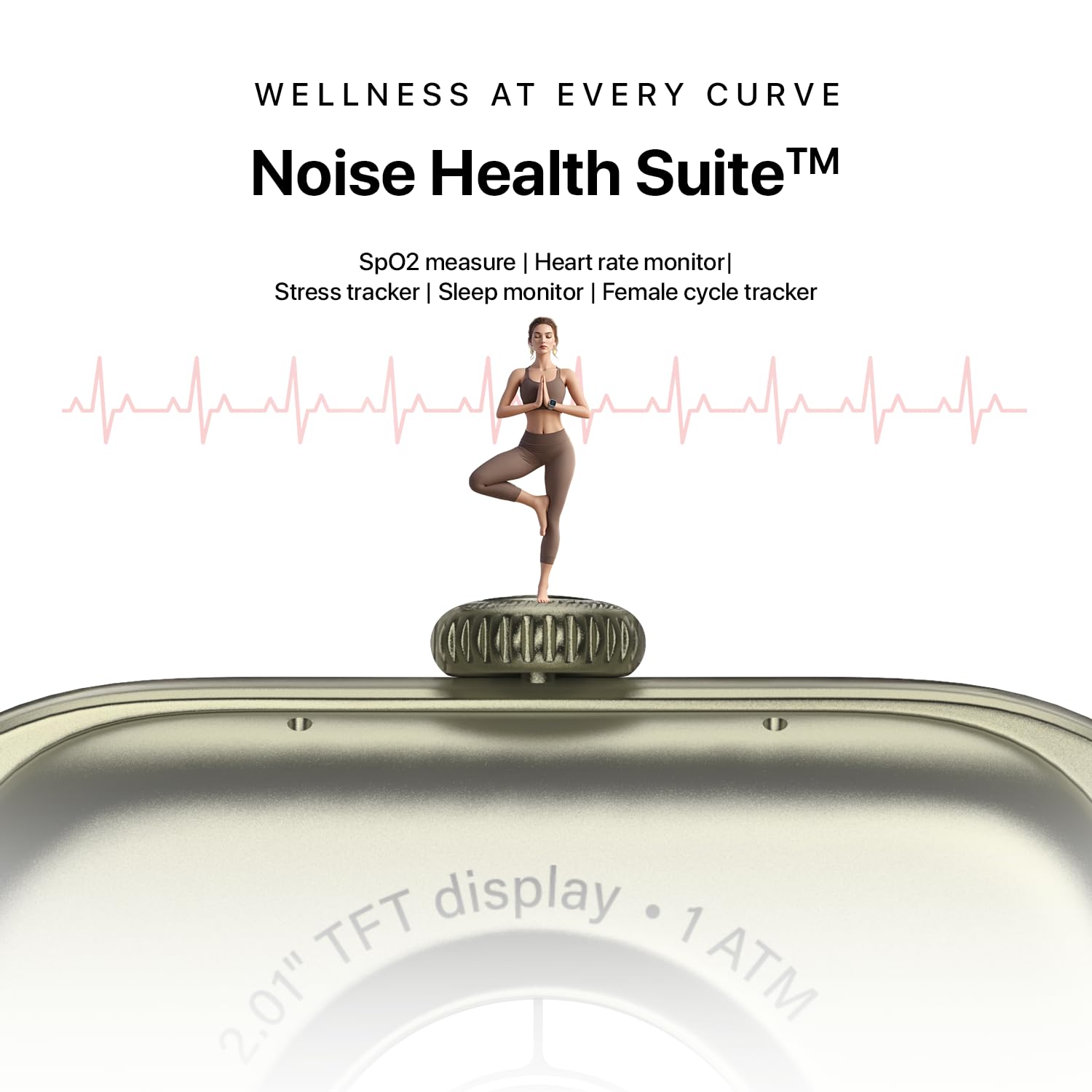 - Comprehensive Health Tracking – Track SpO₂, 24x7 heart rate, stress, sleep, and menstrual cycles via Noise Health Suite to stay on top of your wellness goals.
