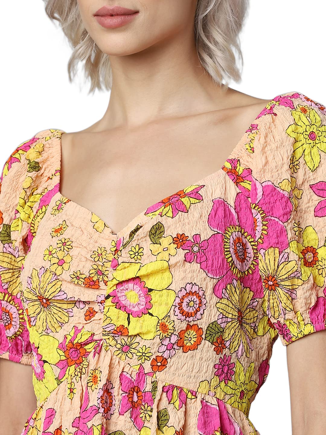 Short dress in textured all over printed woven fabric with a fitted bodice and gently flared skirt. Sweetheart neckline at the front with narrow, covered elastication, and short puff sleeves. Concealed zipper at center back neck. Unlined