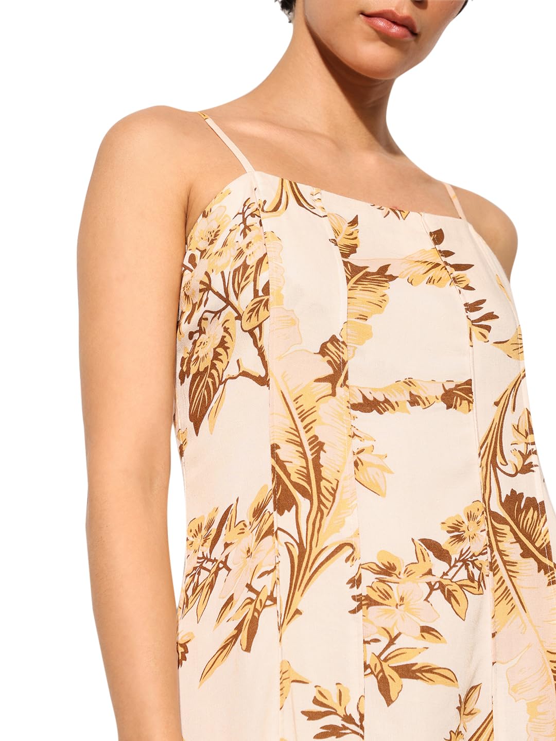 This adjustable strapy, unlined woven mini dress showcases a delicate floral print with gathered pleats. It features asymmetric hemline and also has pockets.