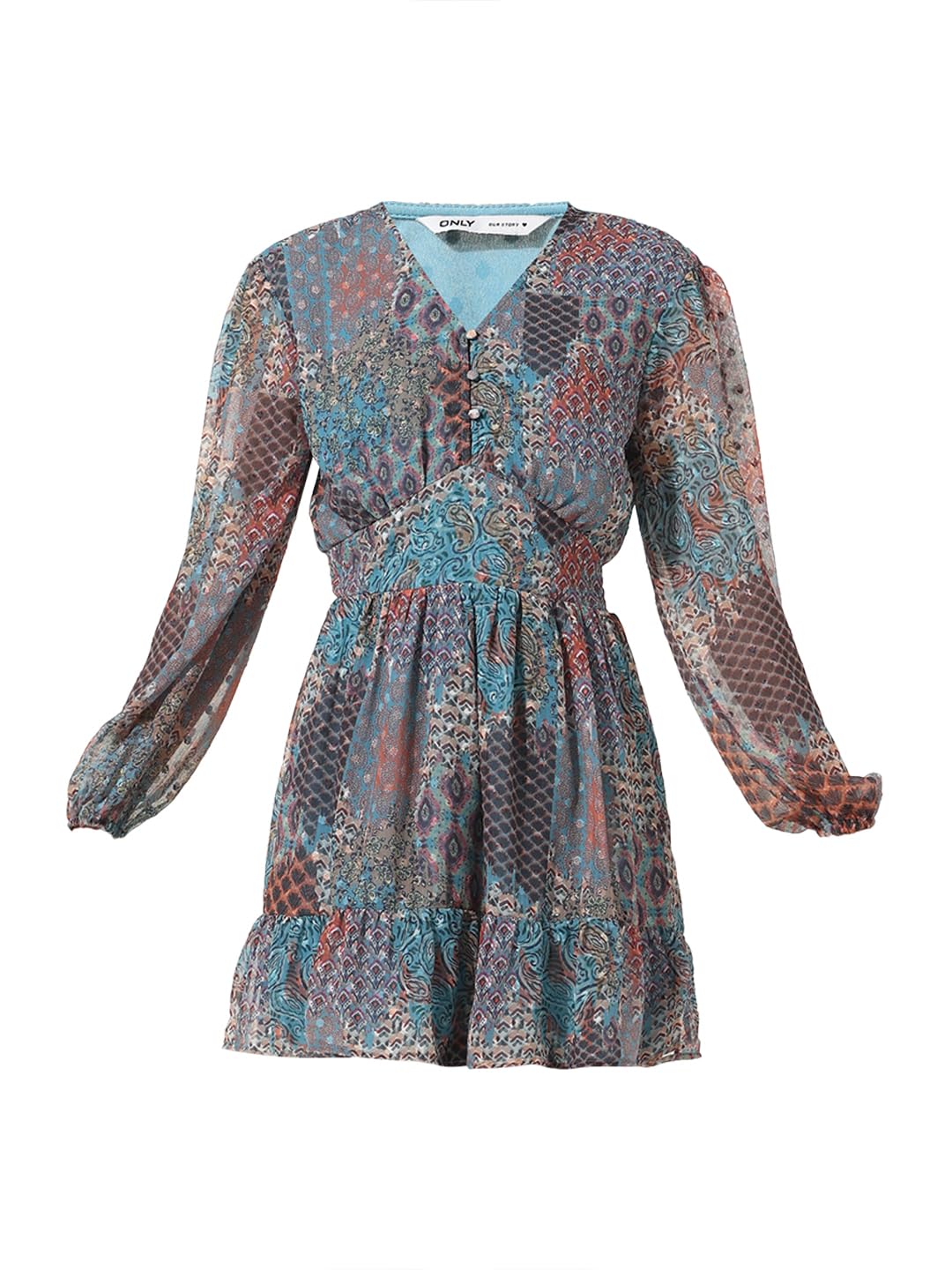 Short dress in All over printed chiffon weave with a V-neck , opening buttons down the front. Long sleeves with covered elastic cuff , ,inserted smock details at back waist flared skirt. lined.