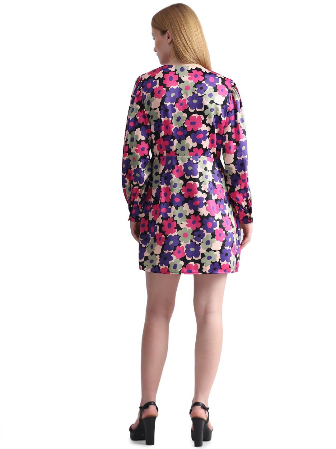 Purple floral print mini dress with a cinched waist, V-neck, and full sleeves. Perfect for a lunch or brunch date when styled with heels and accessories.