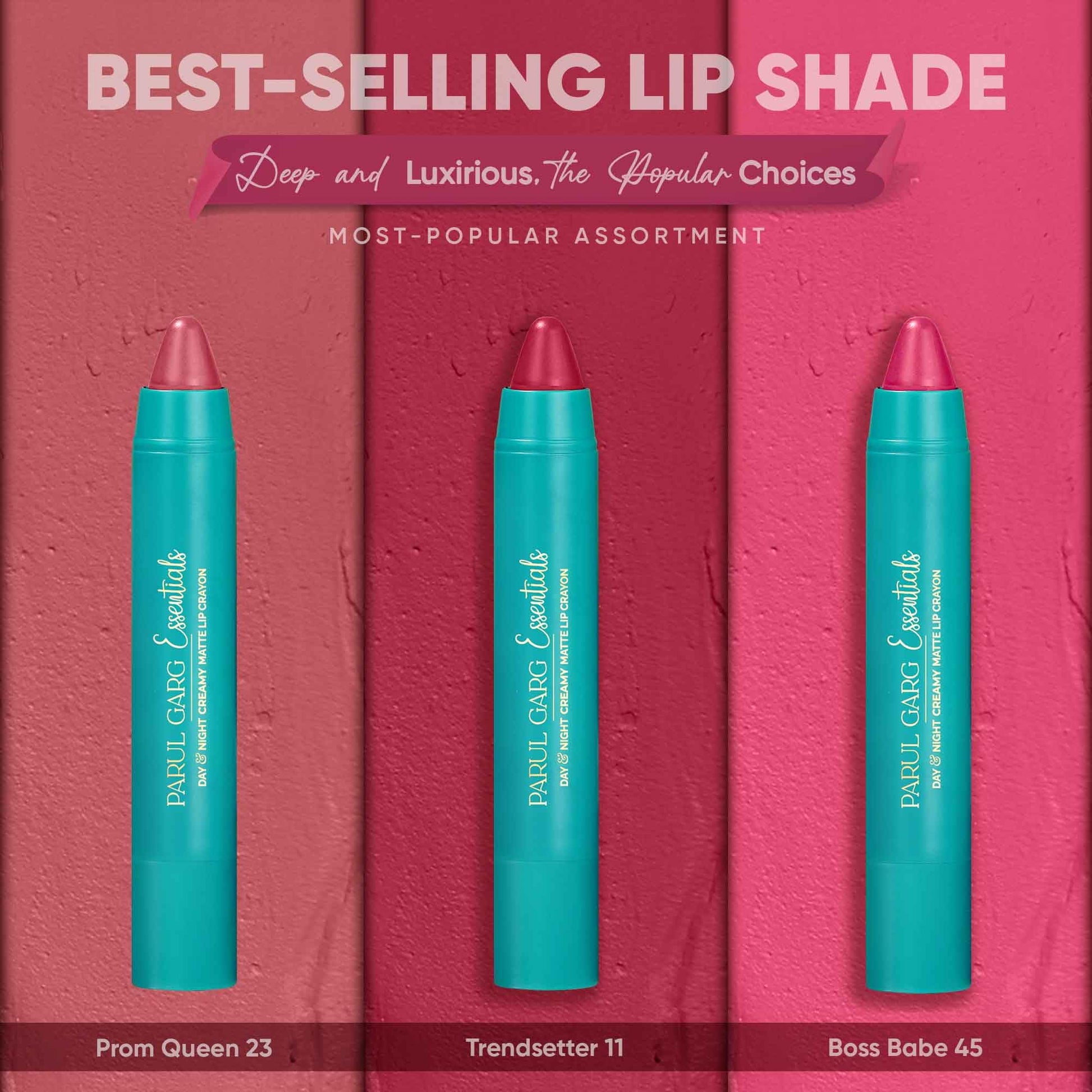 Parul Garg Beauty All-Time Bestsellers Lip Crayon Set | Top 3 Creamy Matte Lipsticks | Rose Pink, Berry & Fuchsia | Bestselling Shades | Vegan, Paraben-Free | Made in India (Trio Pack)