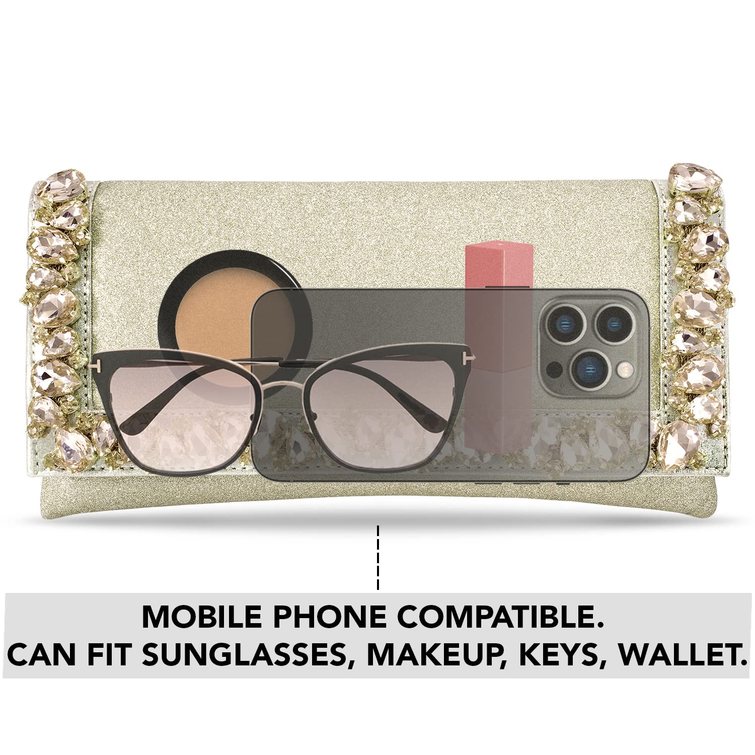 - DESIGN: Embellished with Indian hand work, the soft fabric interior of the evening bag has enough room to keep your credit card, cash, and other small essentials like mobile phones, lipstick, highlighter, keys.