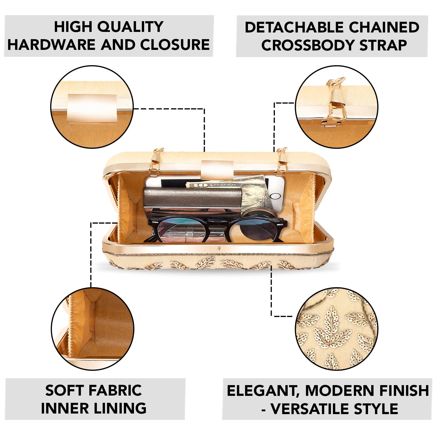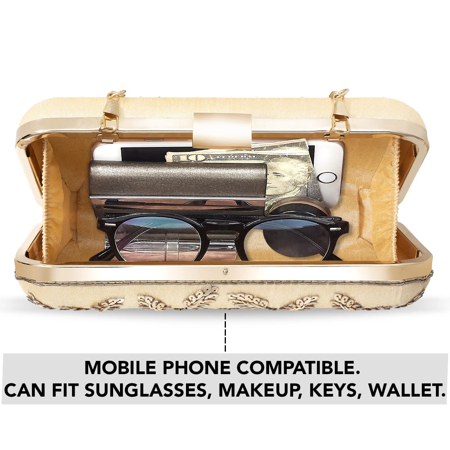 - DESIGN: Embellished with Indian hand work, the soft fabric interior of the evening bag has enough room to keep your credit card, cash, and other small essentials like mobile phones, lipstick, highlighter, keys.